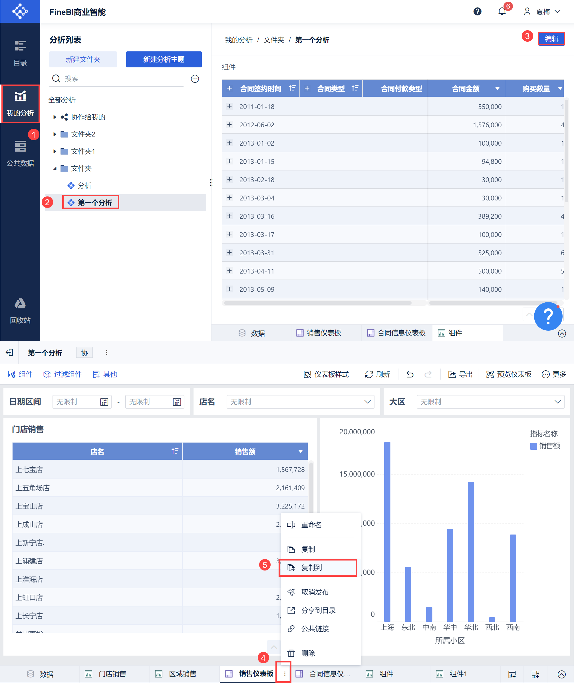 点击「我的分析」,进入分析主题编辑界面,选择需要复制的仪表板,点击「复制到」,如下图所示: