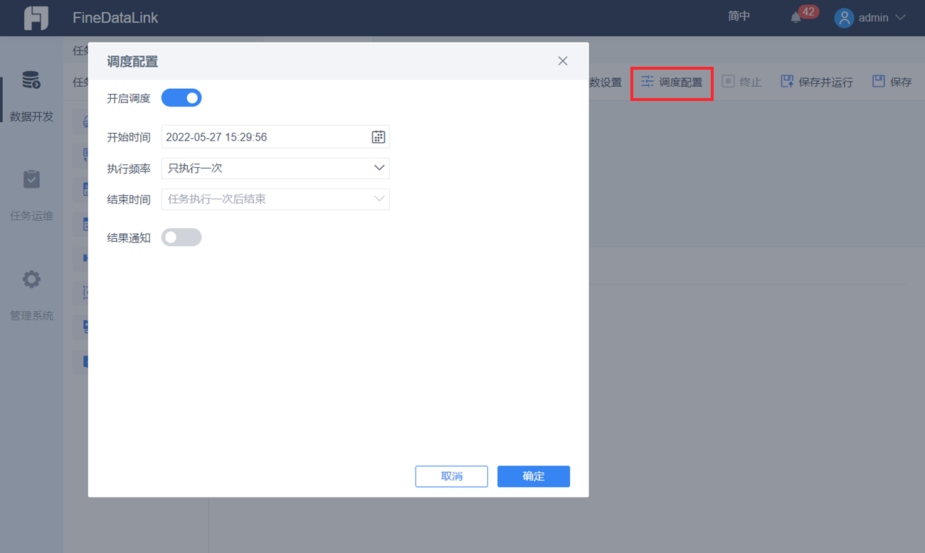 工具栏中的「调度配置」可以让任务定期自动运行,保证数据实时更新,详细介绍参见文档:调度配置