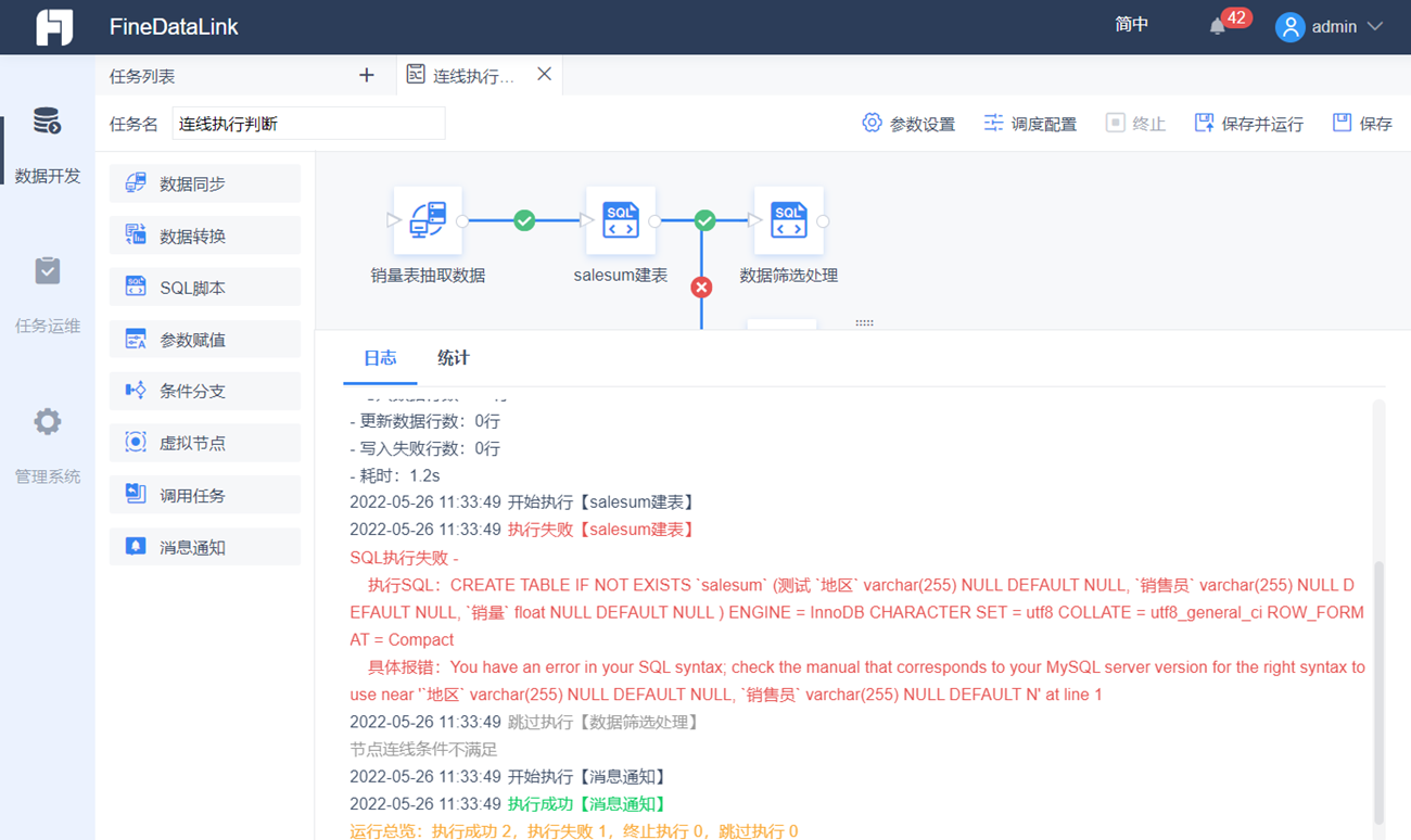 设计好的 ETL 任务可以点击工具栏的「保存并运行」来运行,如果需要中途强制终止任务,可以点击「终止」,操作如下图所示: