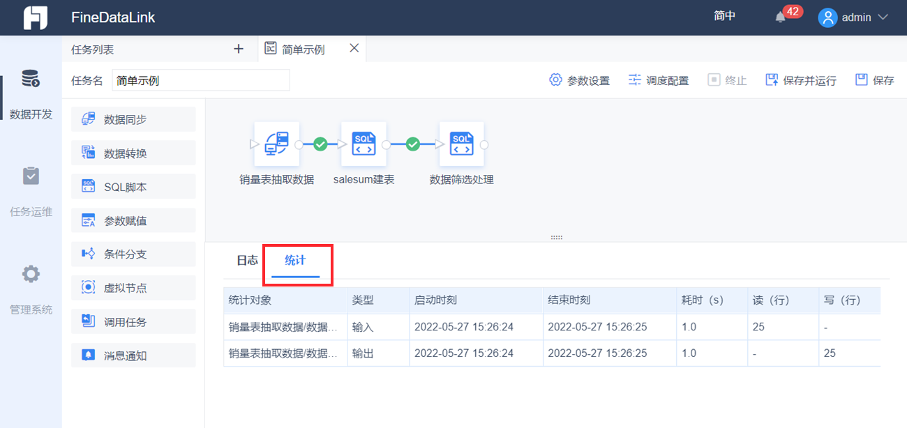 任务日志展示区域的「统计」页可以查看「数据同步」节点和「数据转换」节点的读写信息。