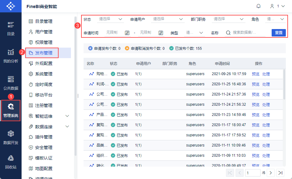 管理员登录FineBI系统,点击「发布管理」,可以查看权限范围内分析用户申请发布/已发布的仪表板和数据集。