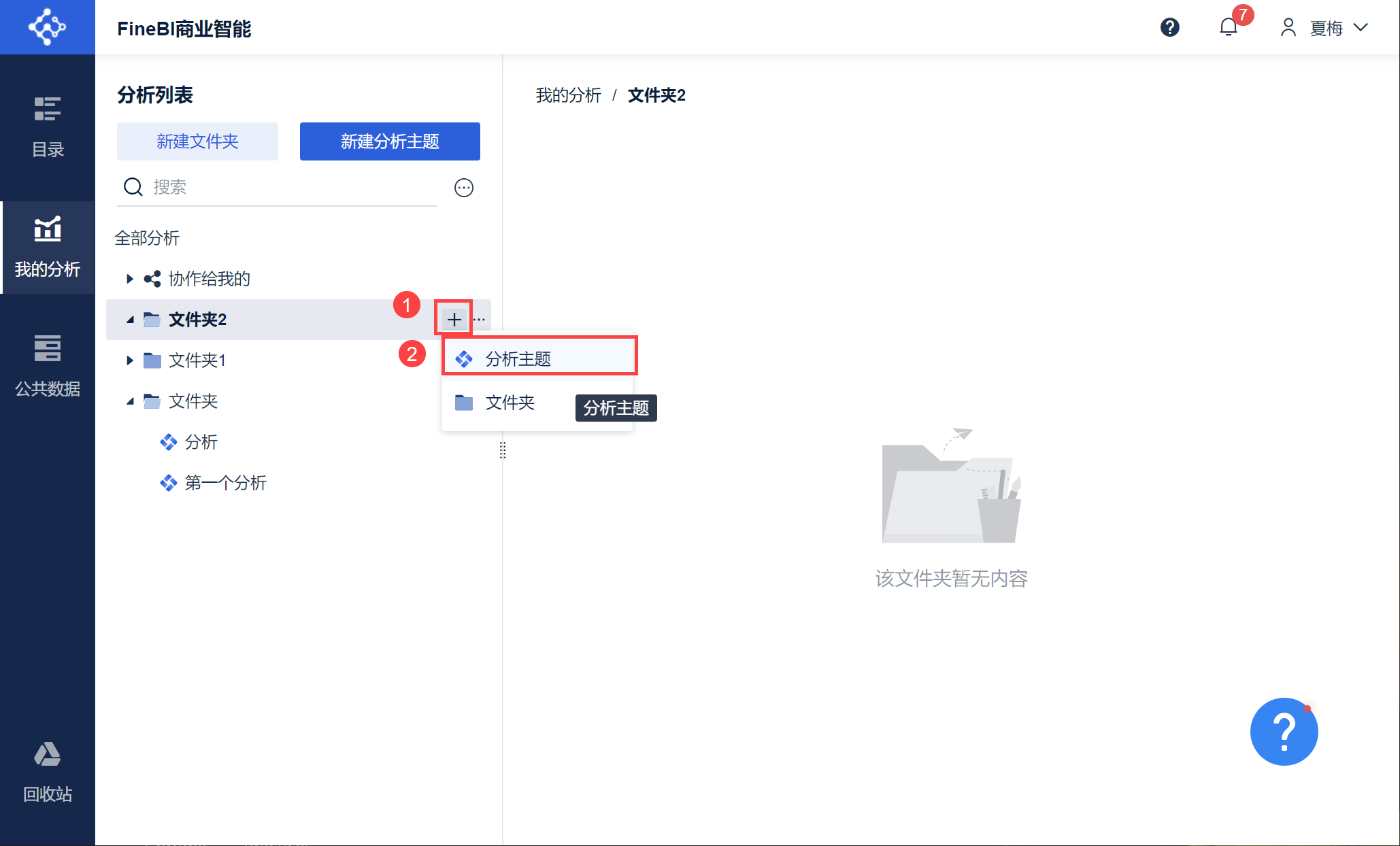 登录 FineBI ,点击「我的分析>新建文件夹」,如下图所示:
