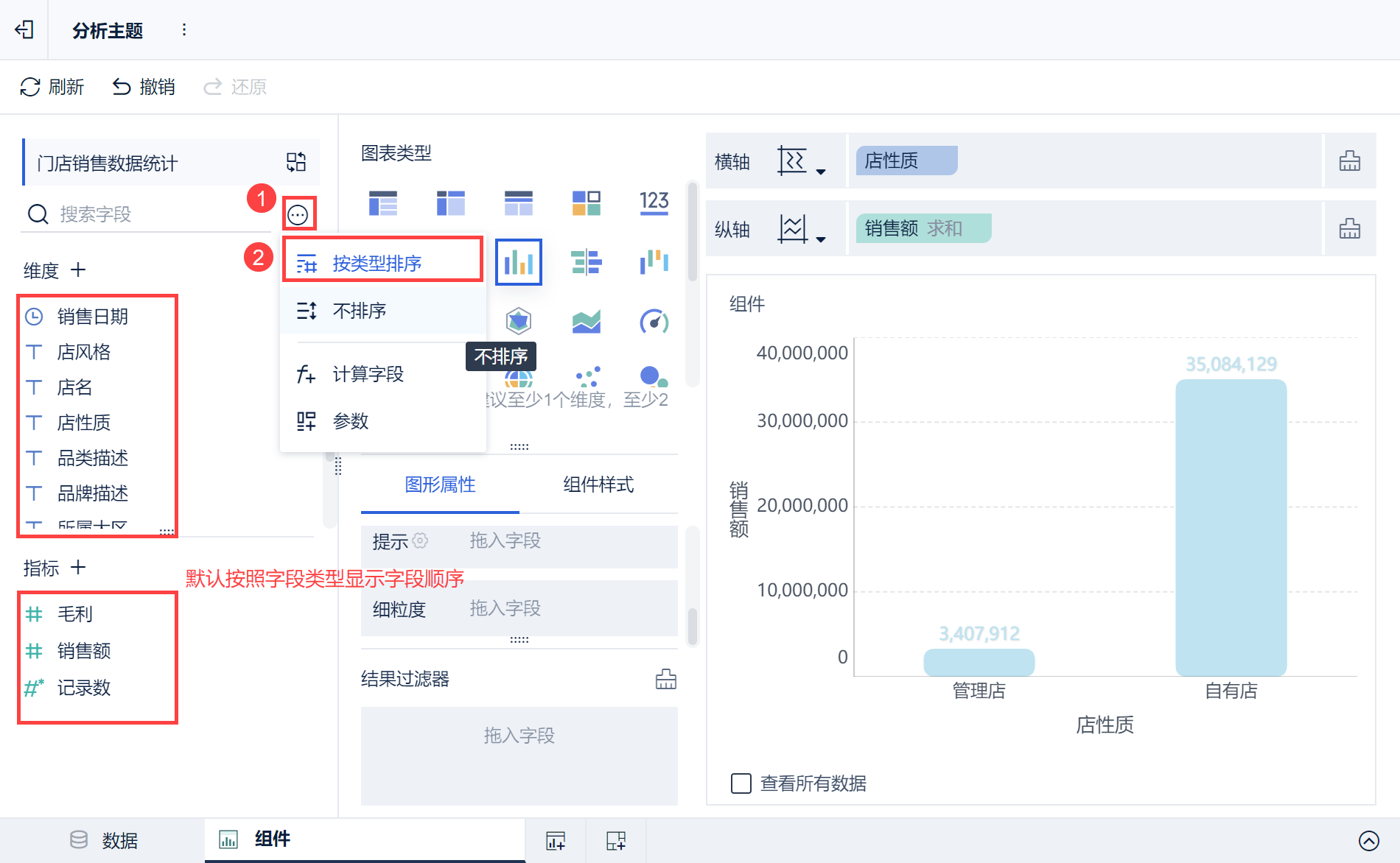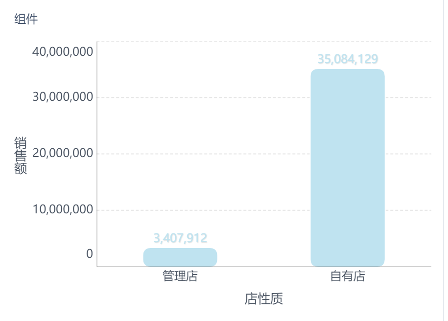 示例选择「门店销售数据统计」作为组件使用的数据,选择「多系列柱形图」,将待分析区域字段「店性质」和「销售额」拖入分析区域,如下图所示: