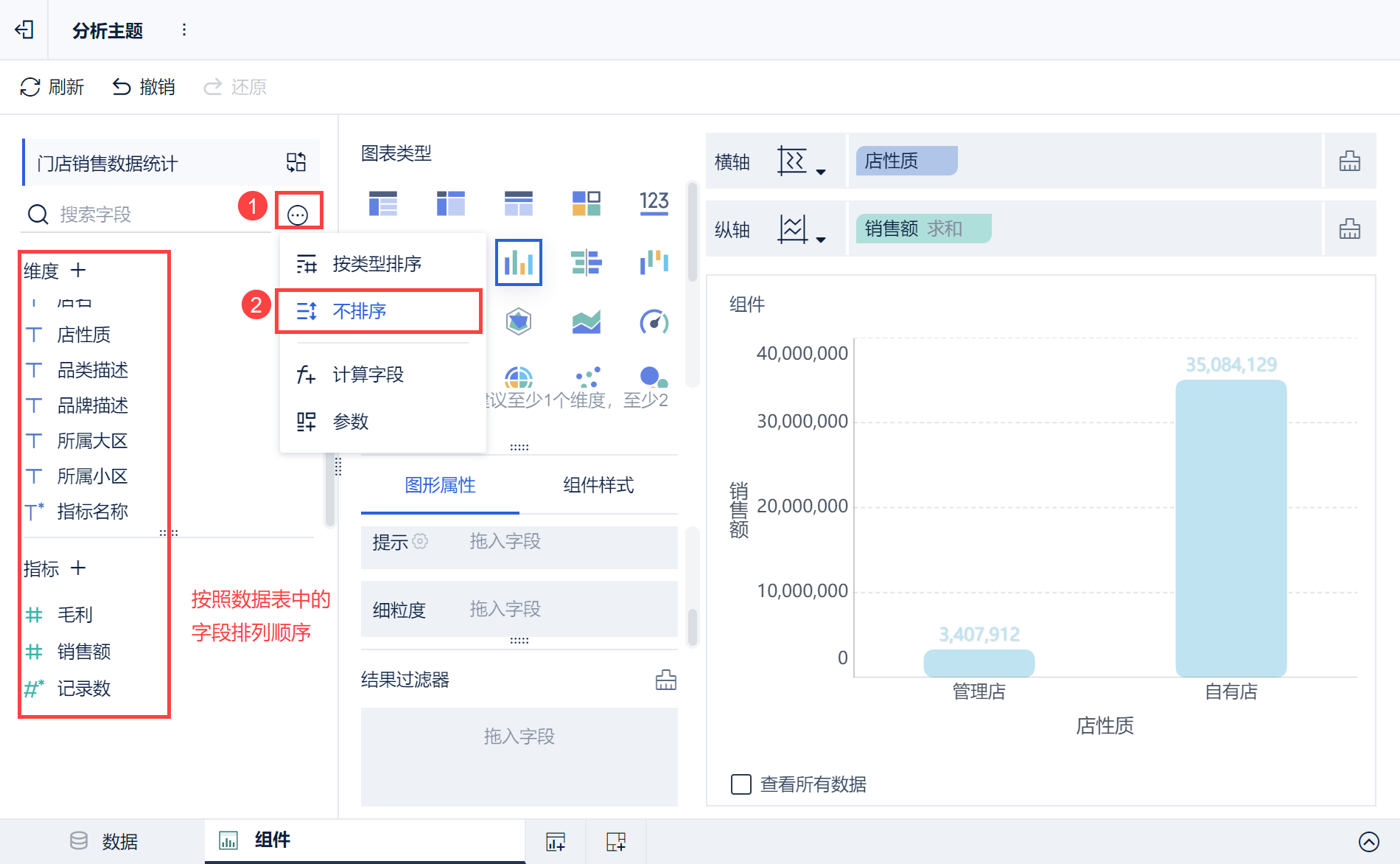若需要按照 BI 中制作组件的来源数据表字段顺序排列,则切换为「不排序」即可,如下图所示: