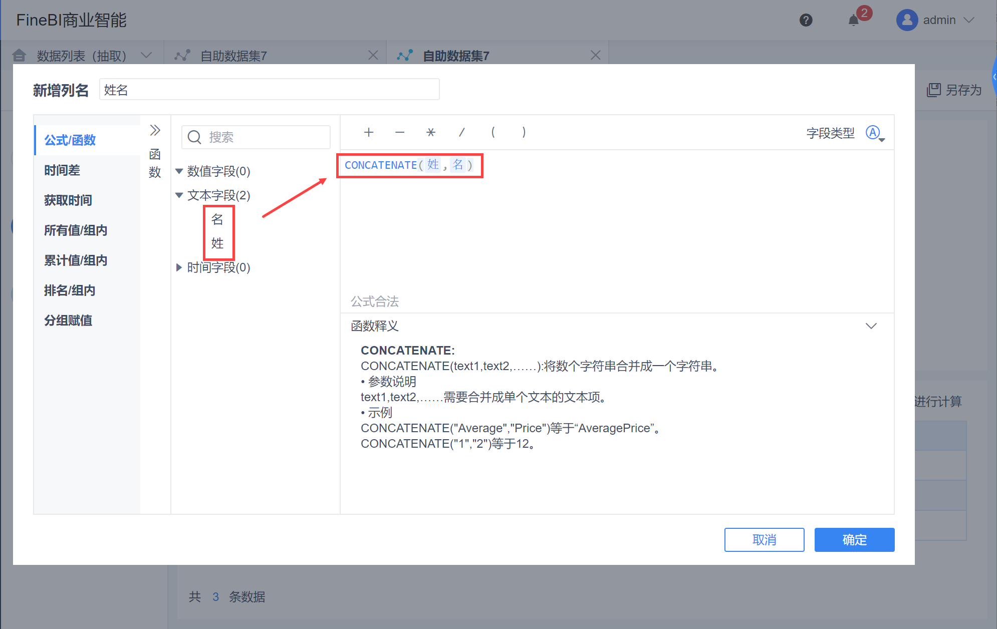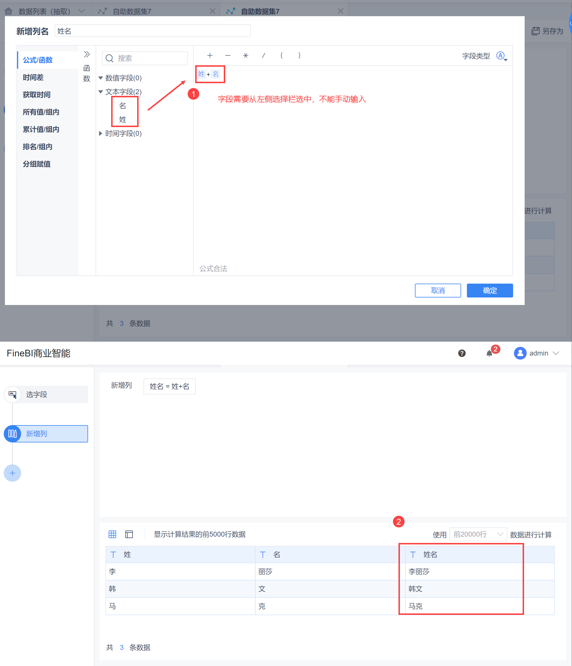 例如需要将姓和名拼接成一个字段「姓名」,如下图所示: