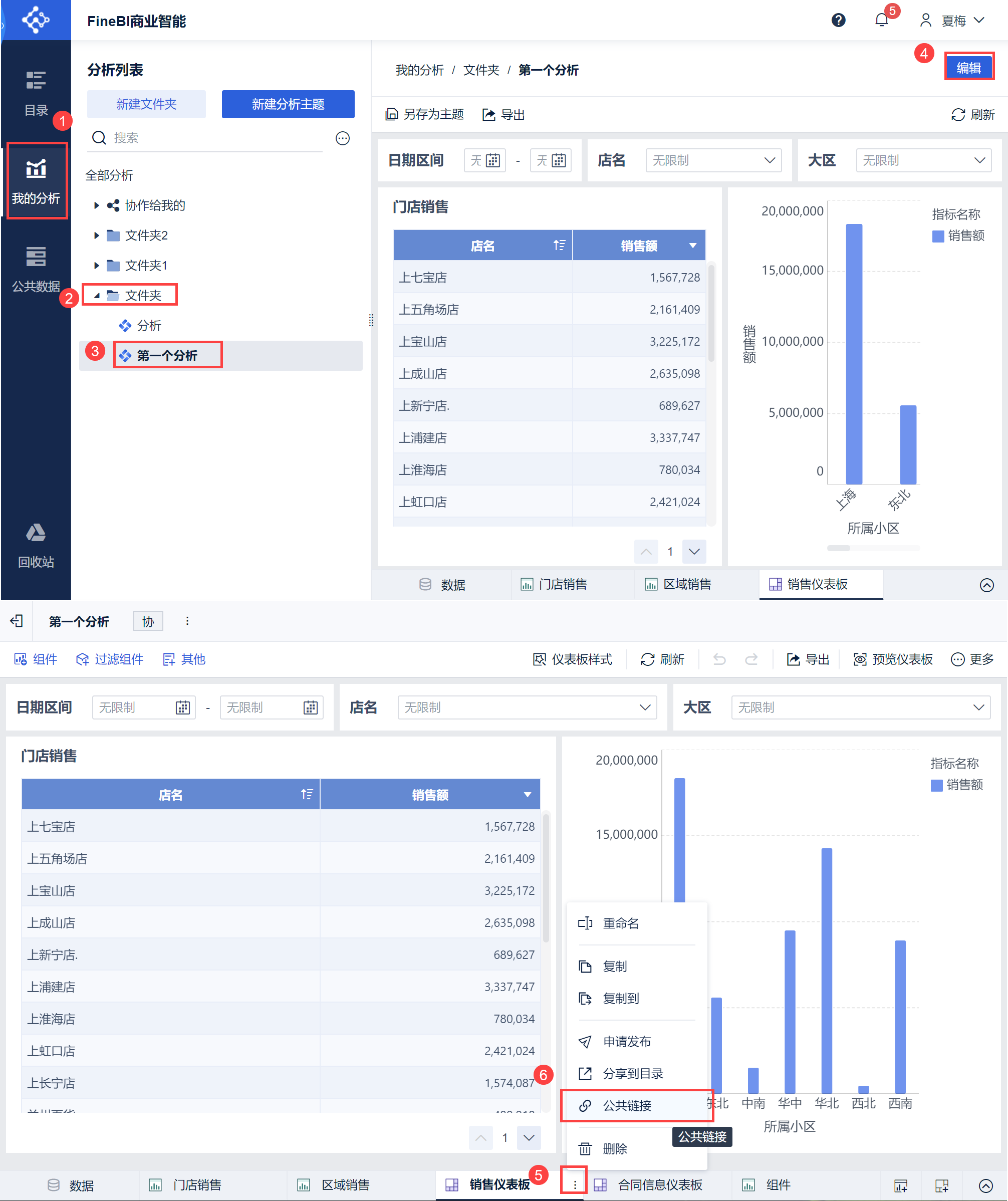 1)例如「夏梅」点击「我的分析」,选择分析主题,点击编辑按钮,进入分析主题编辑界面,在需要发布的仪表板下选择「公共链接」,如下图所示: