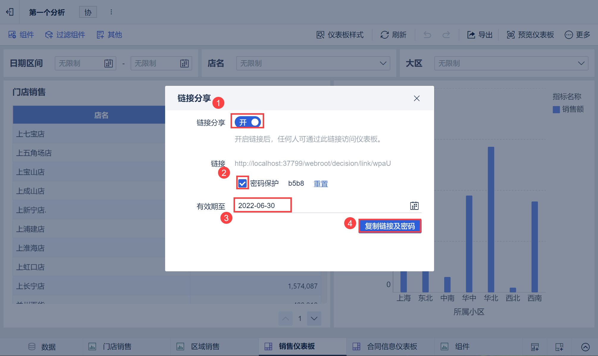 注1:使用公共链接分享仪表板给用户,仪表板进行修改后,无需再次发送分享链接。
