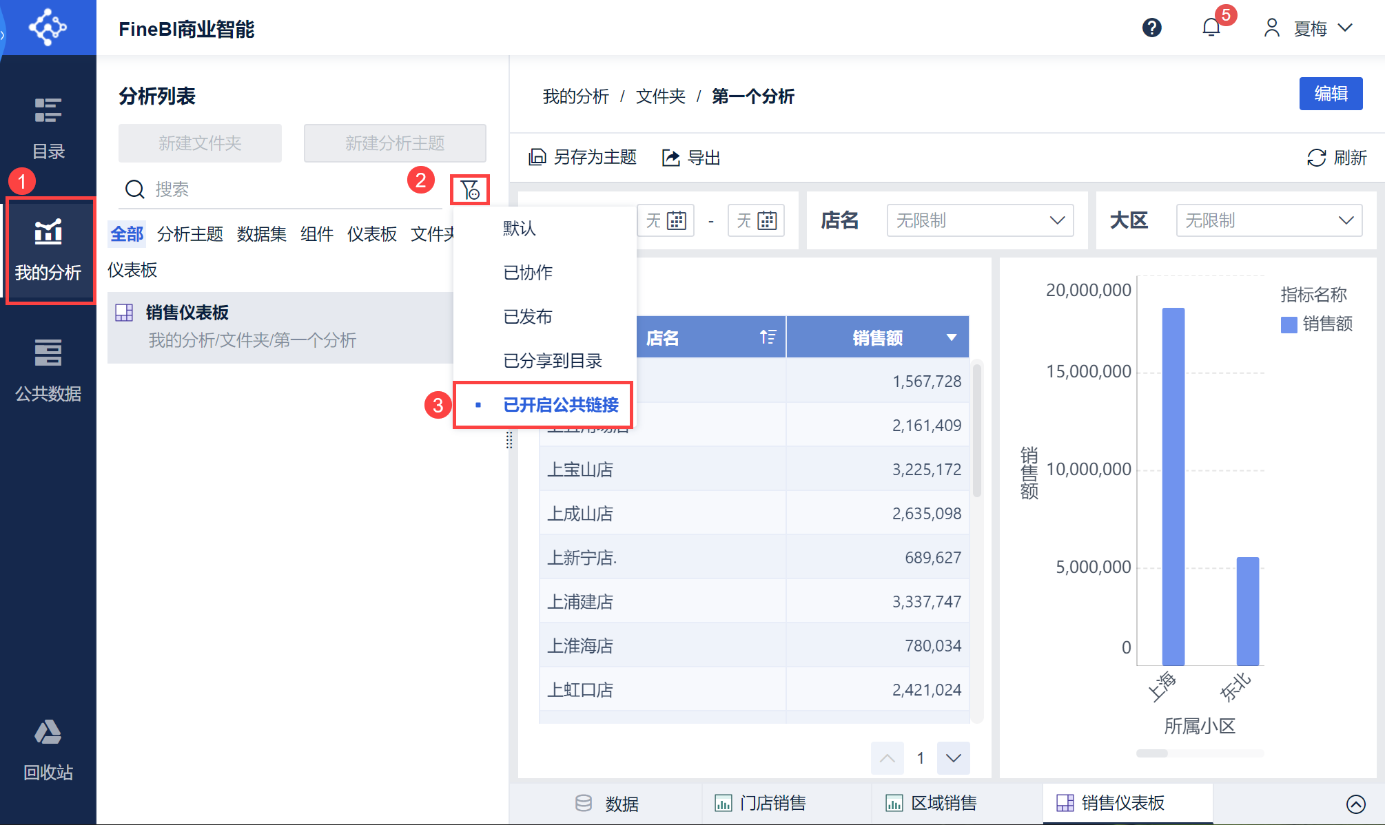 对于开启了公共链接分享的仪表板可以进行统一的查看。进入「我的分析」,在分析列表筛选「已开启公共链接」,如下图所示: