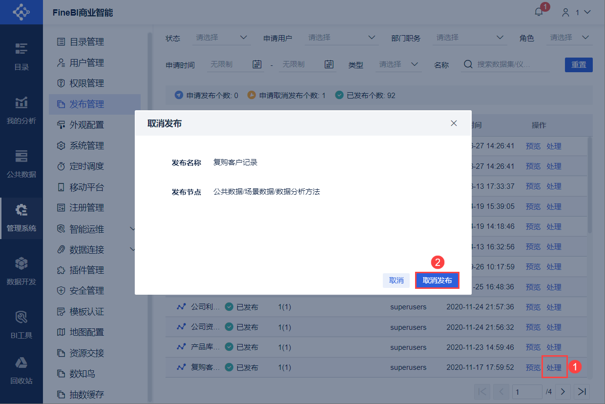 管理员登录FineBI系统,点击「管理系统>发布管理」,点击已发布明细后的「处理」按钮,进入「取消发布」处理界面。