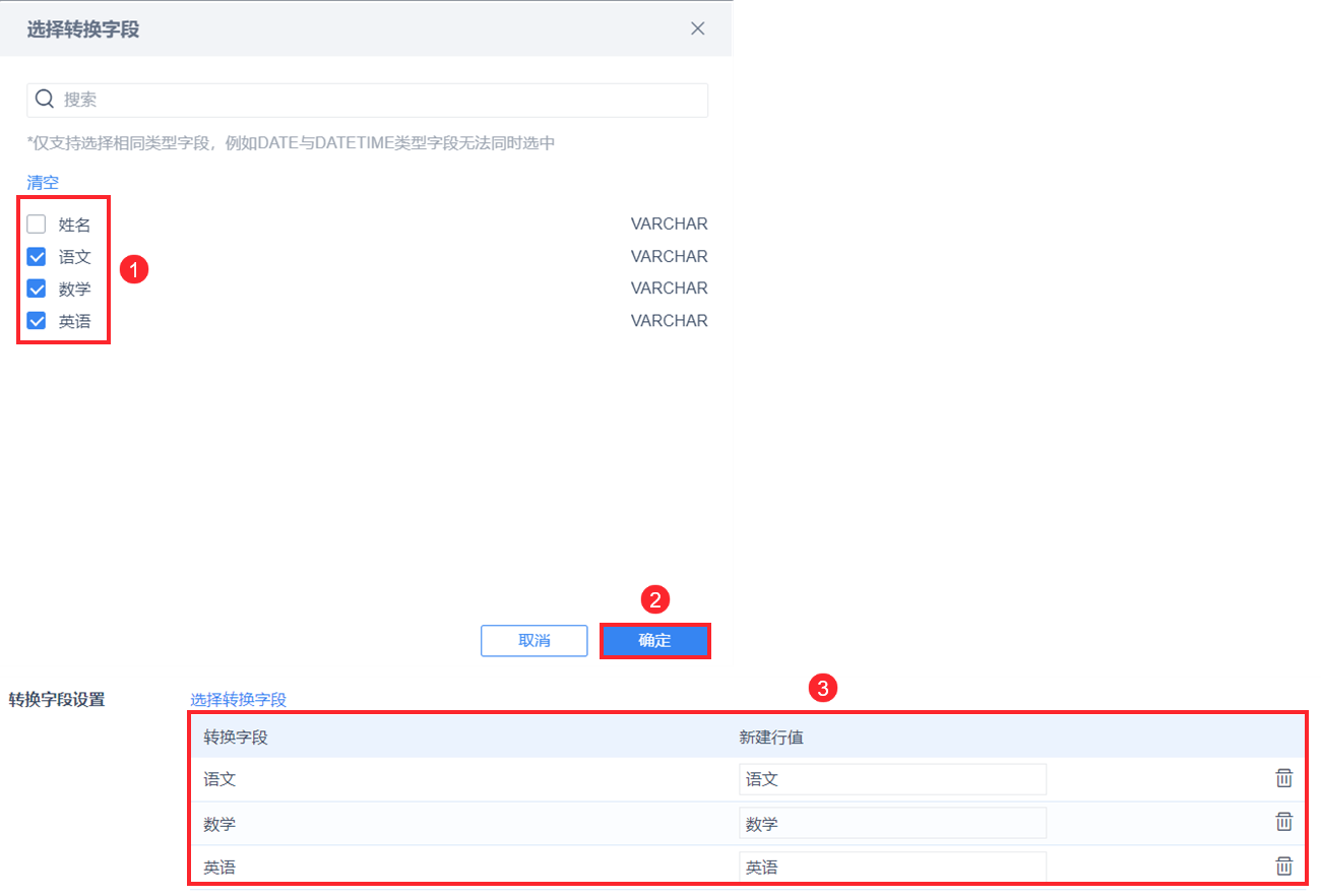 | 取值字段名称 | 列转行时,指定取值字段名称,将所选择的需要列转行的字段值放入该列。字段名称要求与「属性字段名称」要求相同 |