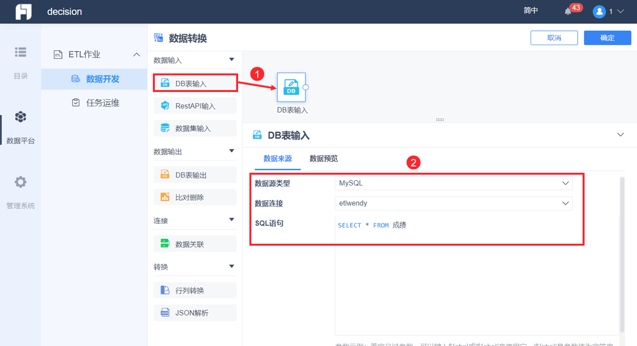 点击「数据转换」节点,将一个「DB表输入」算子拖到数据转换的设计界面,如下图设置数据来源,SQL 语句取出「成绩」表中所有数据。如下图所示: