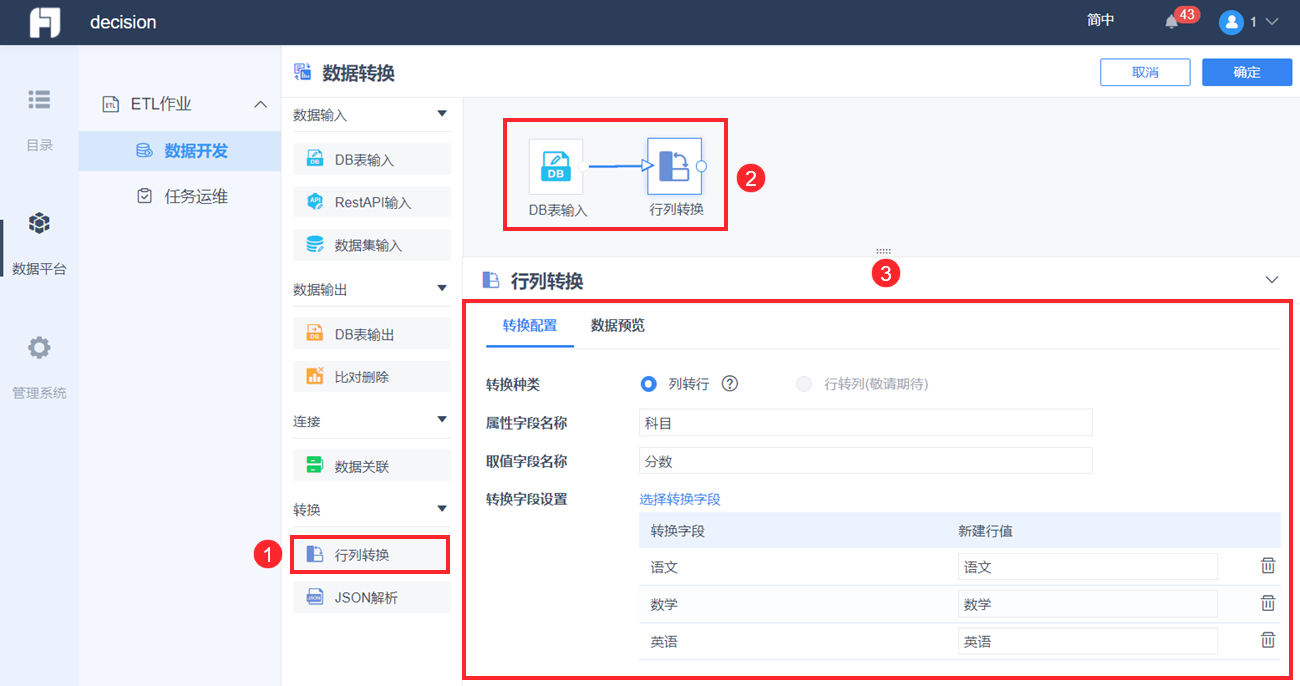 再将一个「行列转换」算子拖到设计界面,并使用线条跟它的上游「DB表输入」算子相连。