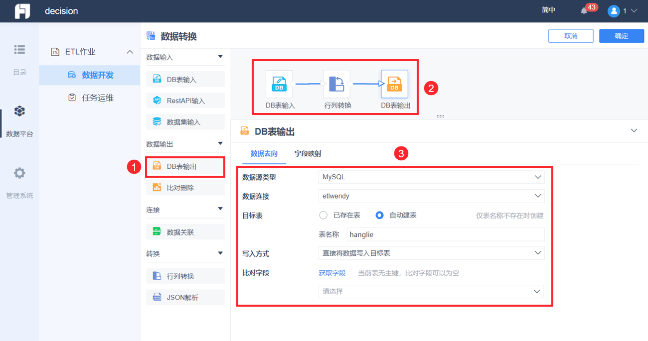 再将一个「DB表输出」算子拖到设计界面,并使用线条跟它的上游「行列转换」算子相连。