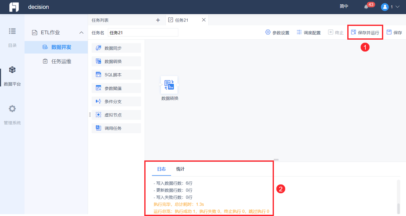2)点击右上角「保存并运行」,日志有执行成功信息表示任务成功运行。如下图所示: