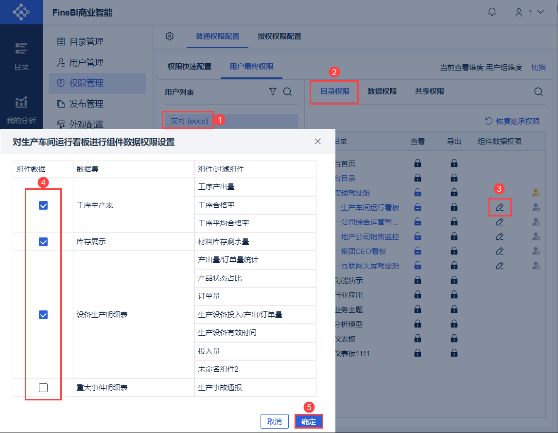 选择权限载体「部门/角色/用户」,本示例选择用户eoco,在「目录权限」点开「管理驾驶舱」节点,点击具体仪表板后的「组件数据权限」设置按钮,如下图所示: