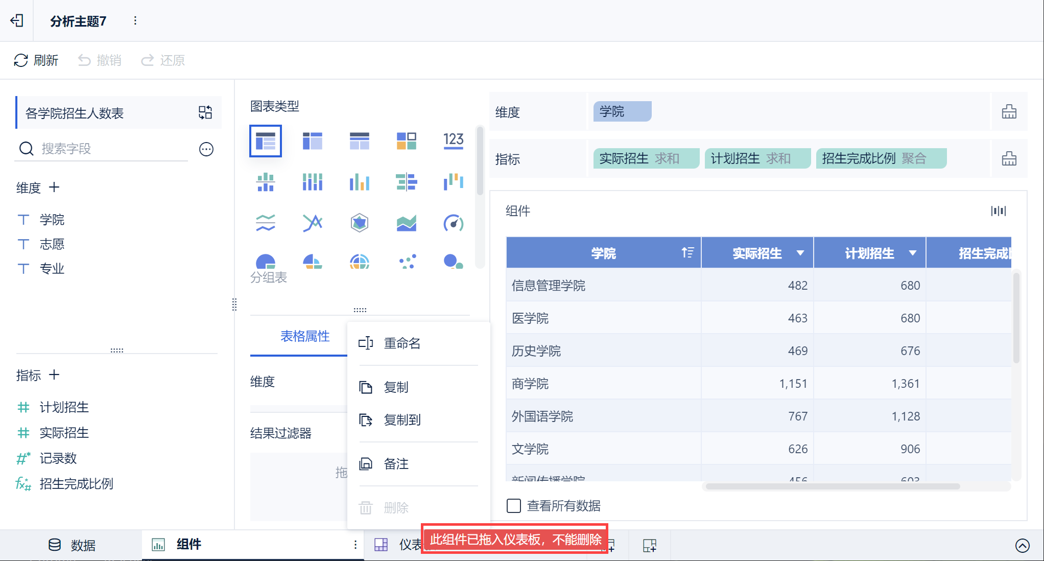 直接在分析主题中点击组件,进入组件编辑界面,即可直接编辑组件,如下图所示: