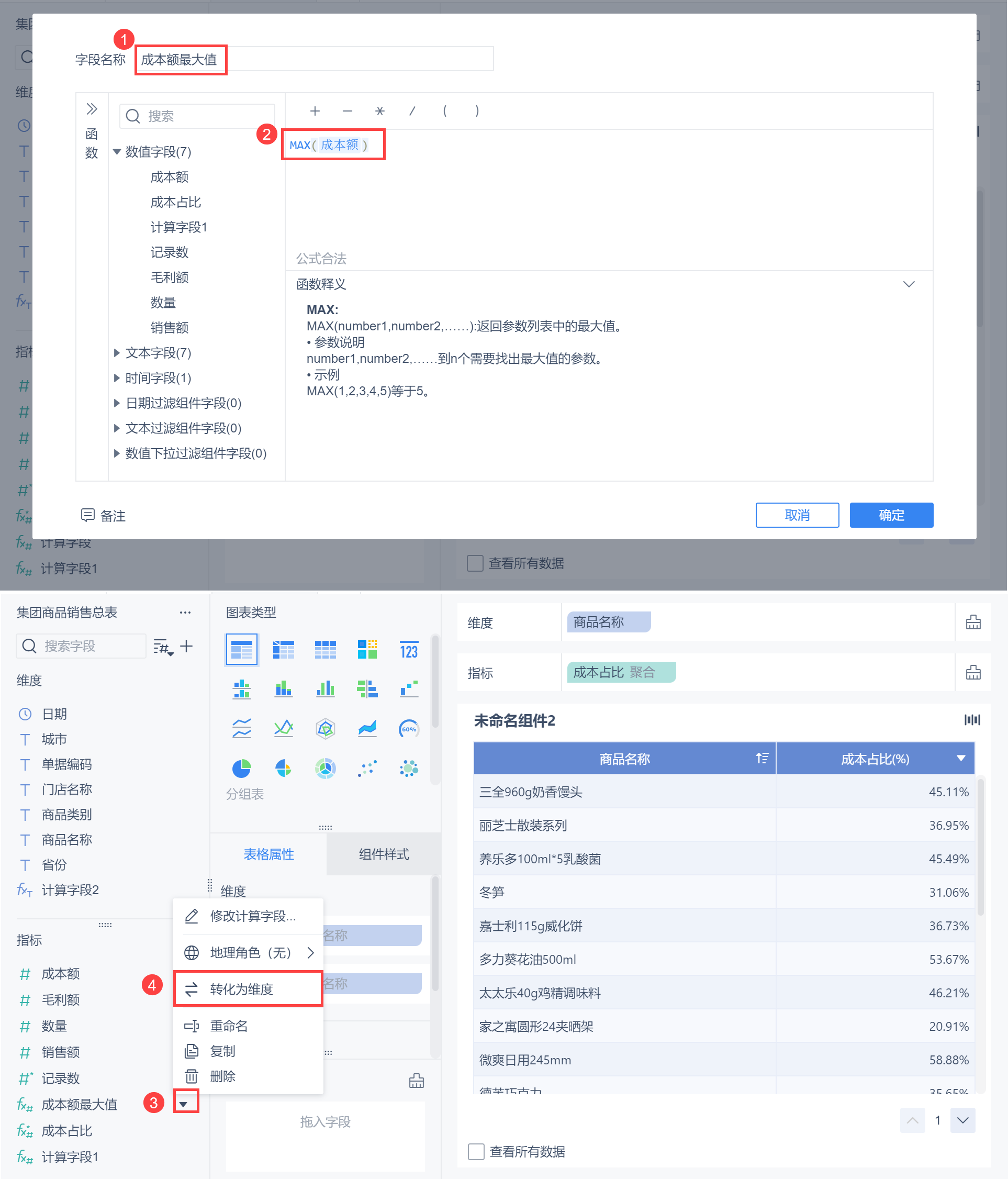 注:当计算字段进行过维度指标转化后,不再支持待分析维度/指标的操作,不可以编辑;复制的计算字段被复制后,该字段支持的操作与被复制的字段一致。