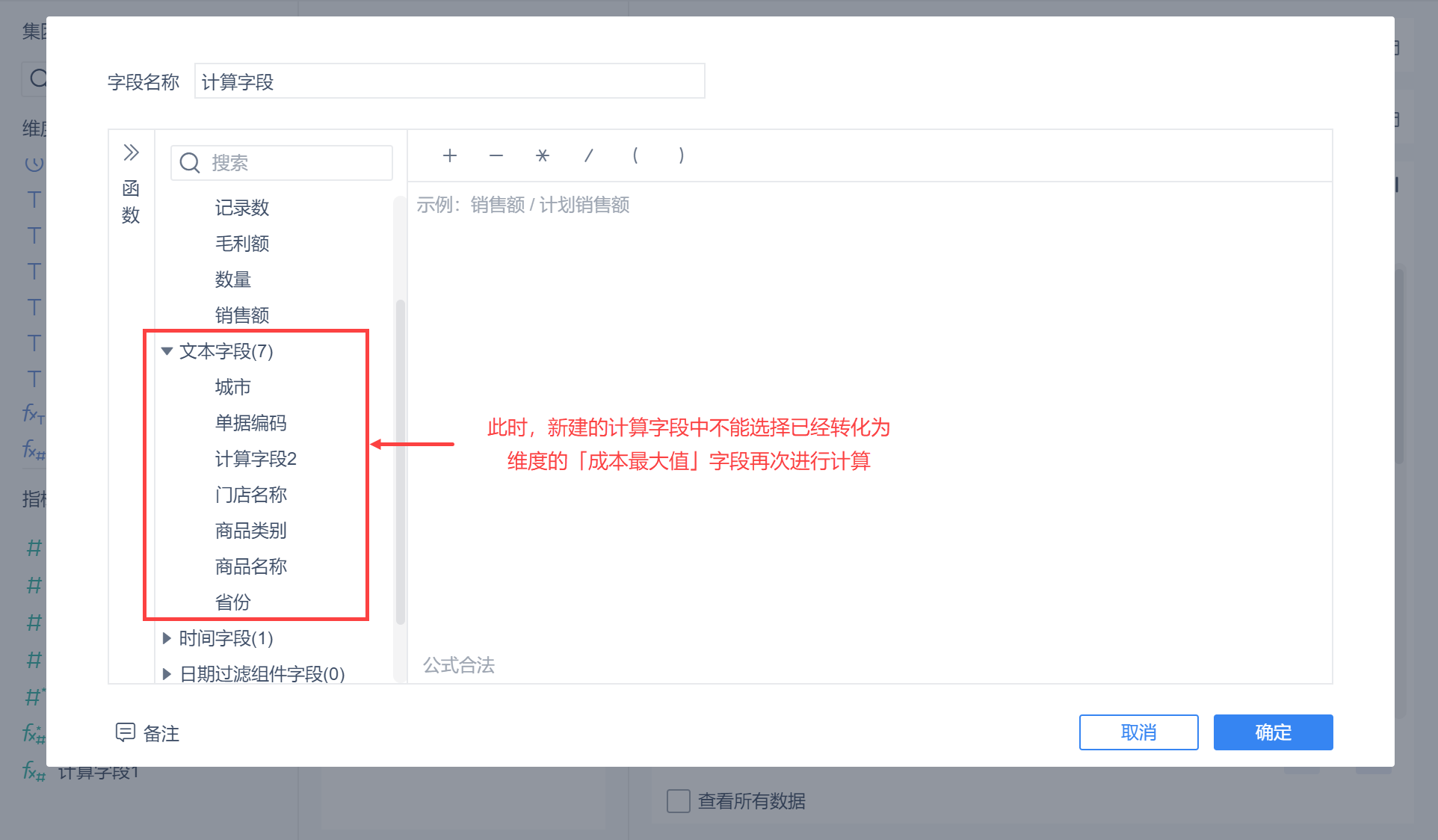 修改计算字段名称,在公式输入区输入公式需要使用的函数、字段、运算符号等,点击确定即可保存。