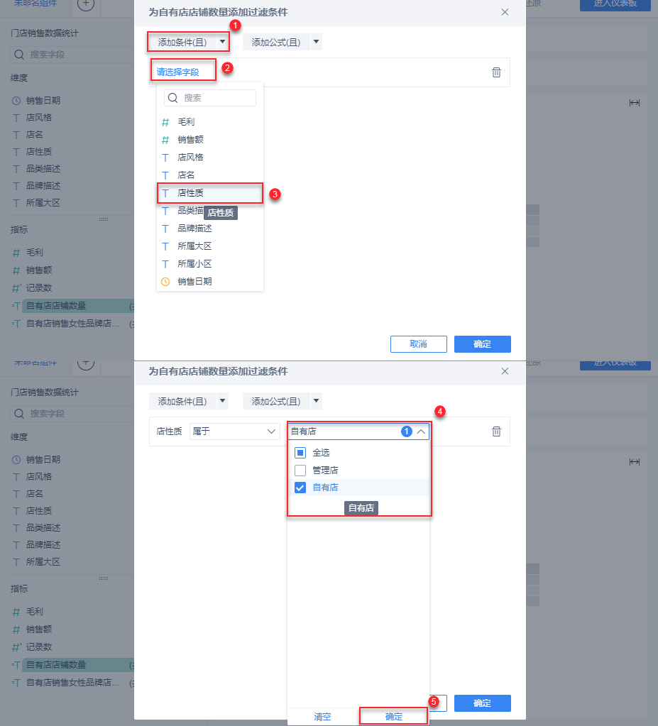 1)步骤同上,添加明细过滤条件,点击「添加条件> 选择字段>店性质」,选择店性质「属于」「自有店」,再重复步骤,选择「品类描述」字段,点击所有女性品牌字段,点击「确定」。如下图所示: