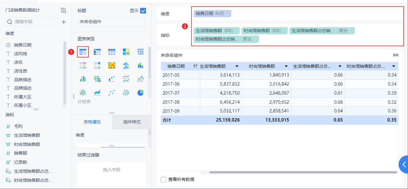 复制「销售额」指标,进行明细过滤,过滤条件为店风格属于「时尚馆」,添加计算字段:时尚馆每月销售额/每月总销售额;