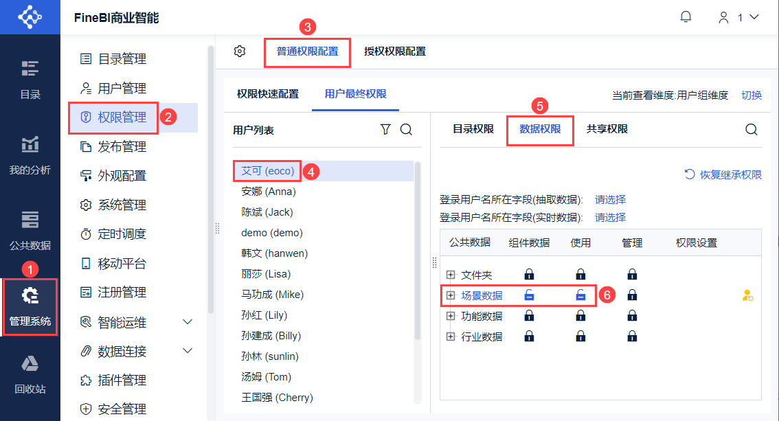 给用户「eoco」分配权限,使得eoco可以在「我的分析」下的主题数据中,调用「场景数据」文件夹中的数据表。