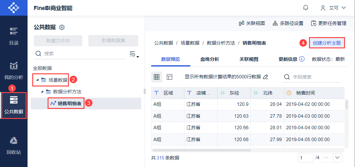 1)在「公共数据」Tab下,可选中「场景数据」下的表,直接「创建分析主题」。