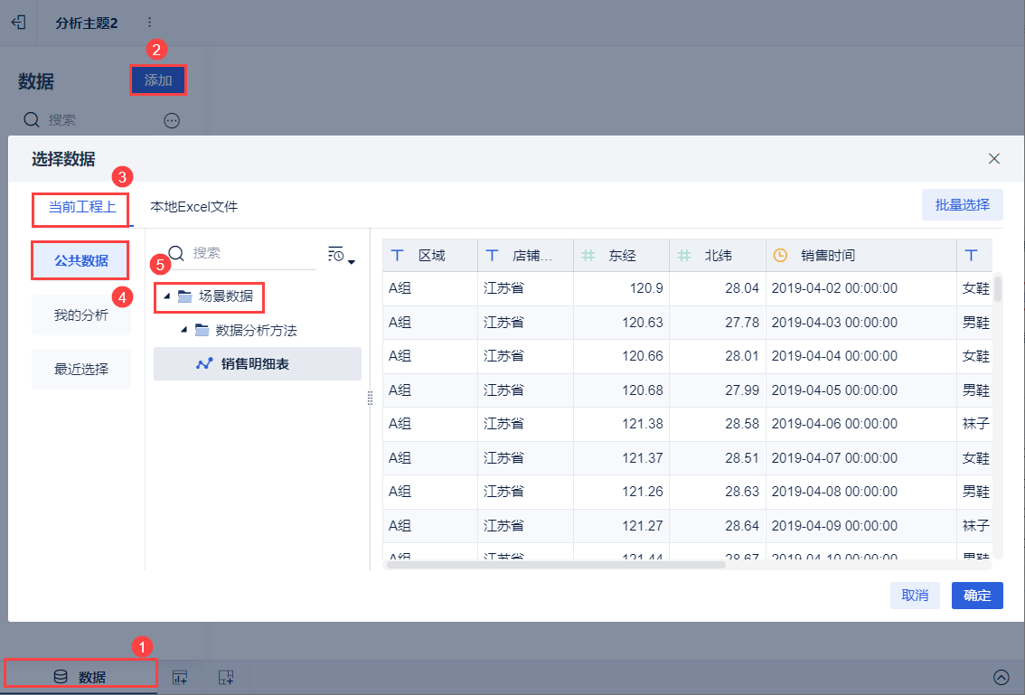 2)在「我的分析」Tab下,在分析主题编辑界面,在添加数据时,可选择「公共数据」中「场景数据」下的任意表。