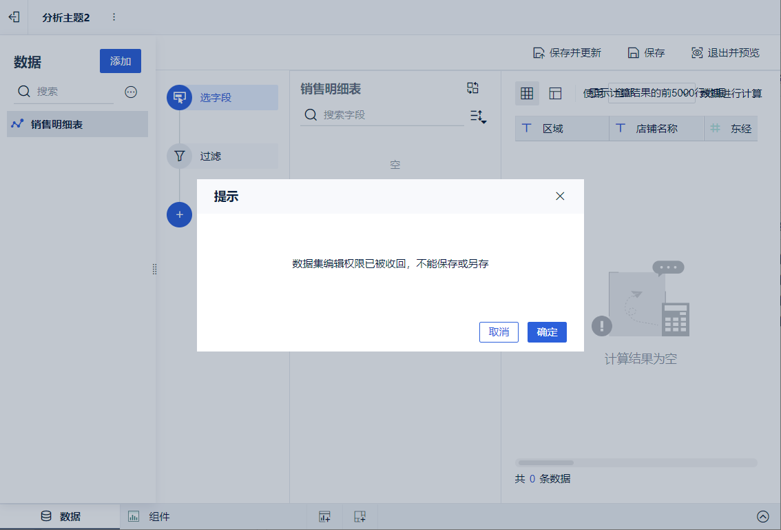若表的使用权限被收回,在「我的分析」下编辑相关表并保存时,跳出提示「数据集编辑权限已被收回,不能保存或另存」。