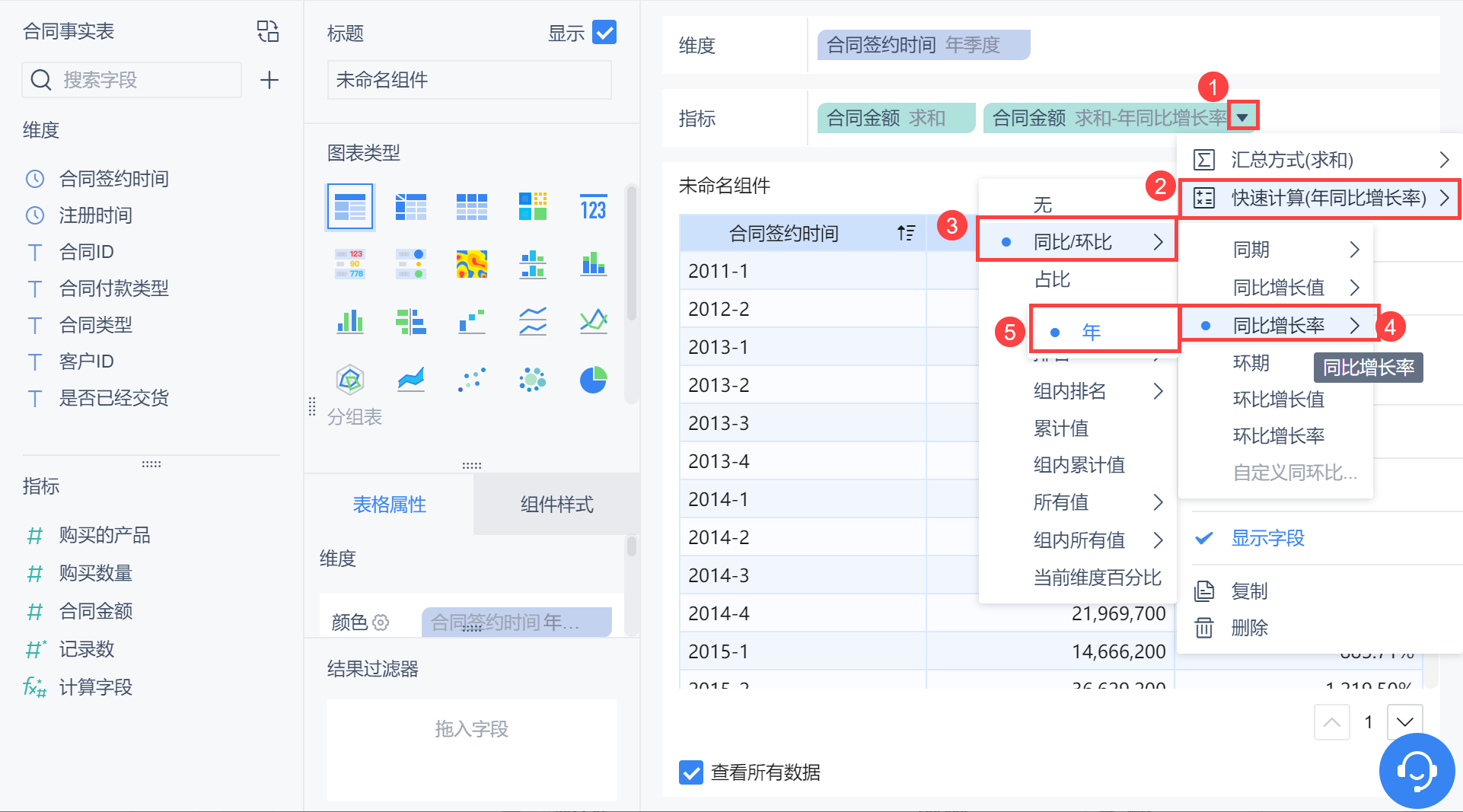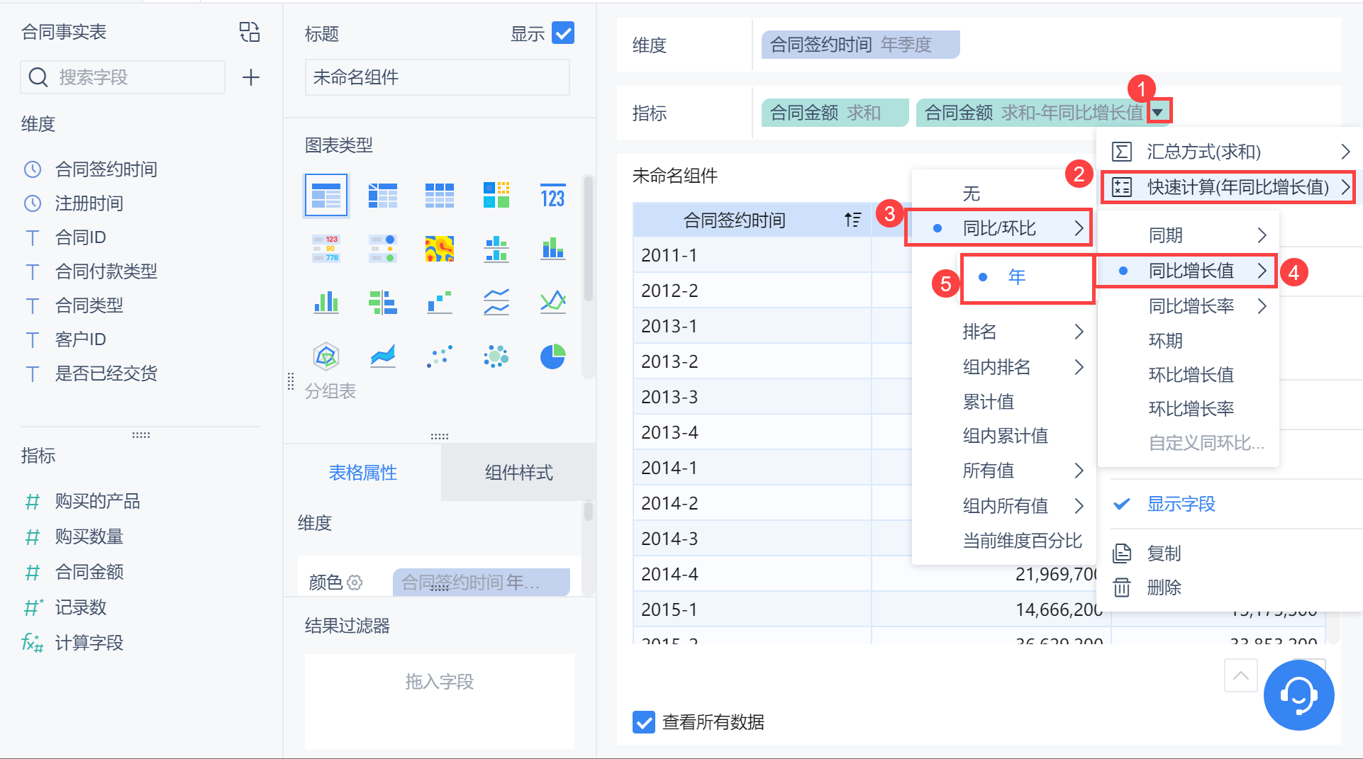 维度中拖入「合同签约时间」,更改分组为「年季度」,为方便对比,在指标栏拖入两个「合同金额」,对后一个「合同金额」字段求「年同比增长值」,如下图所示: