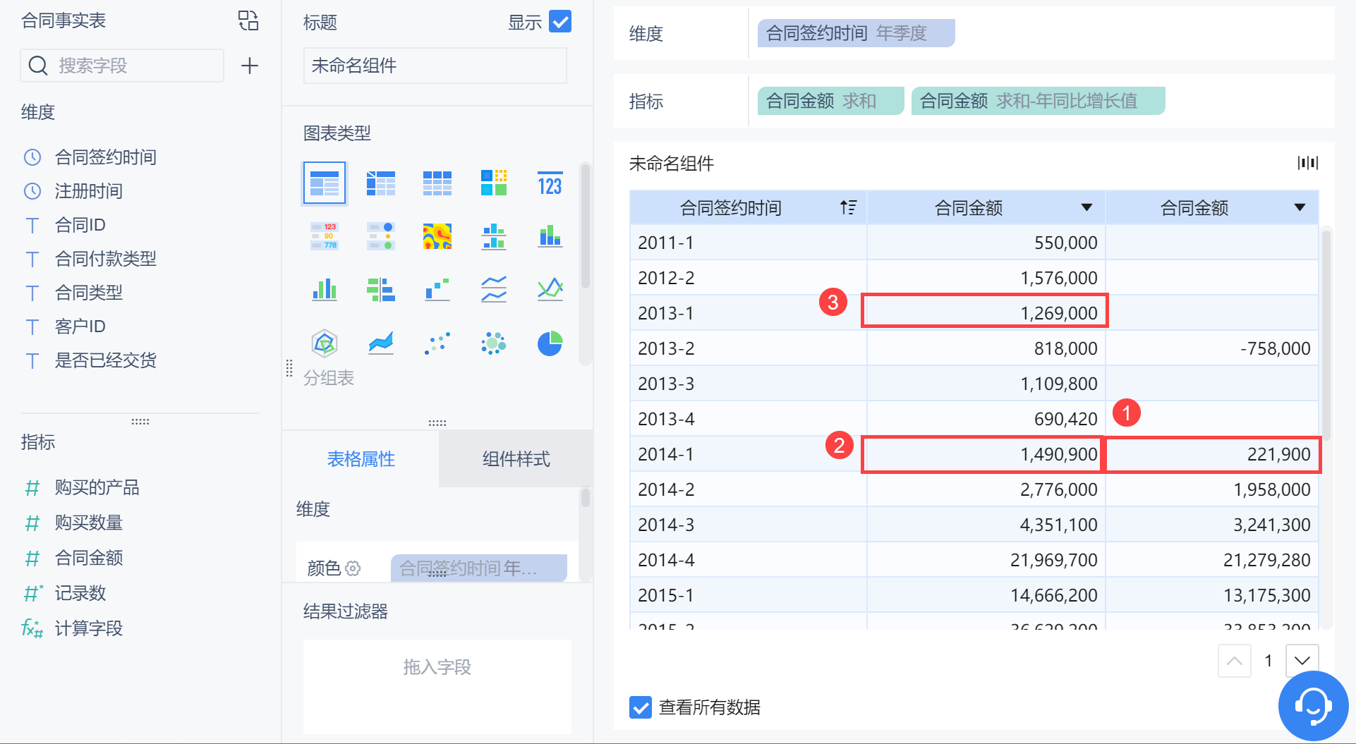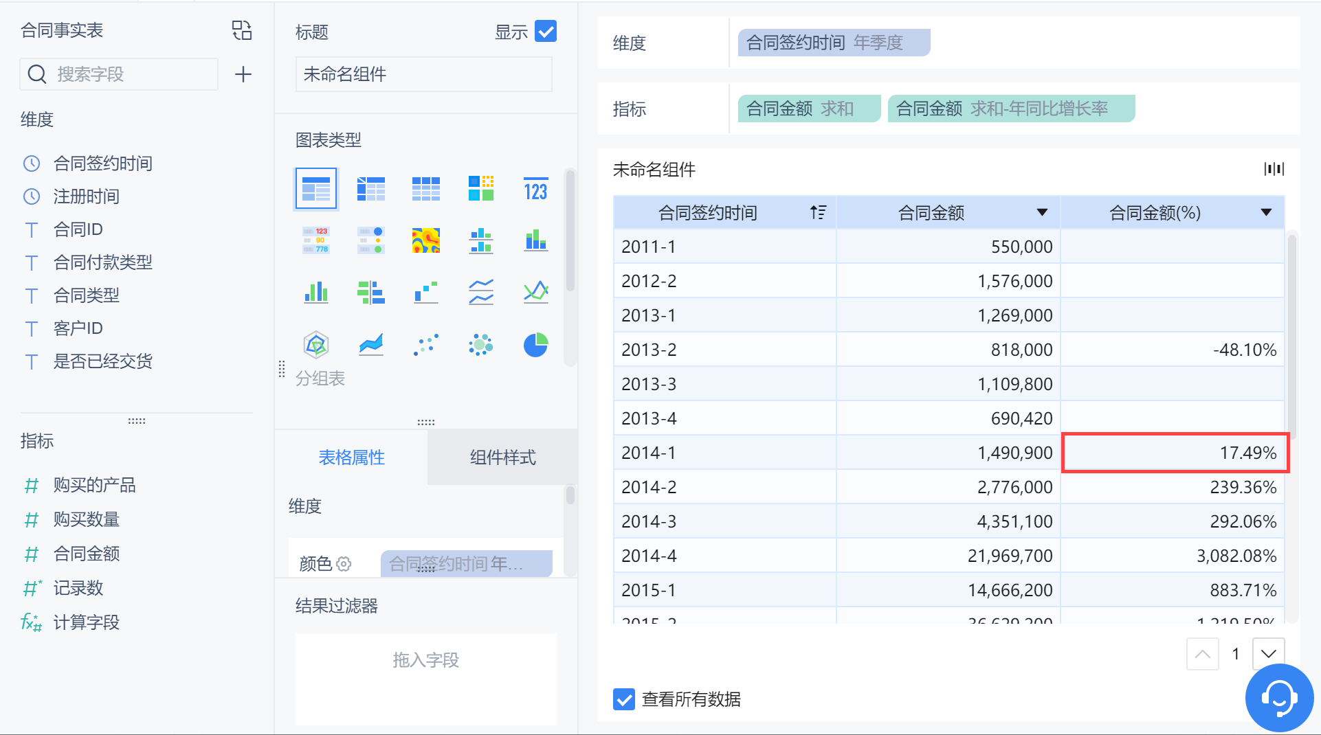 维度中拖入「合同签约时间」,更改分组为「年季度」,为方便对比,在指标栏拖入两个「合同金额」,对后一个「合同金额」字段求「年同期」,如下图所示: