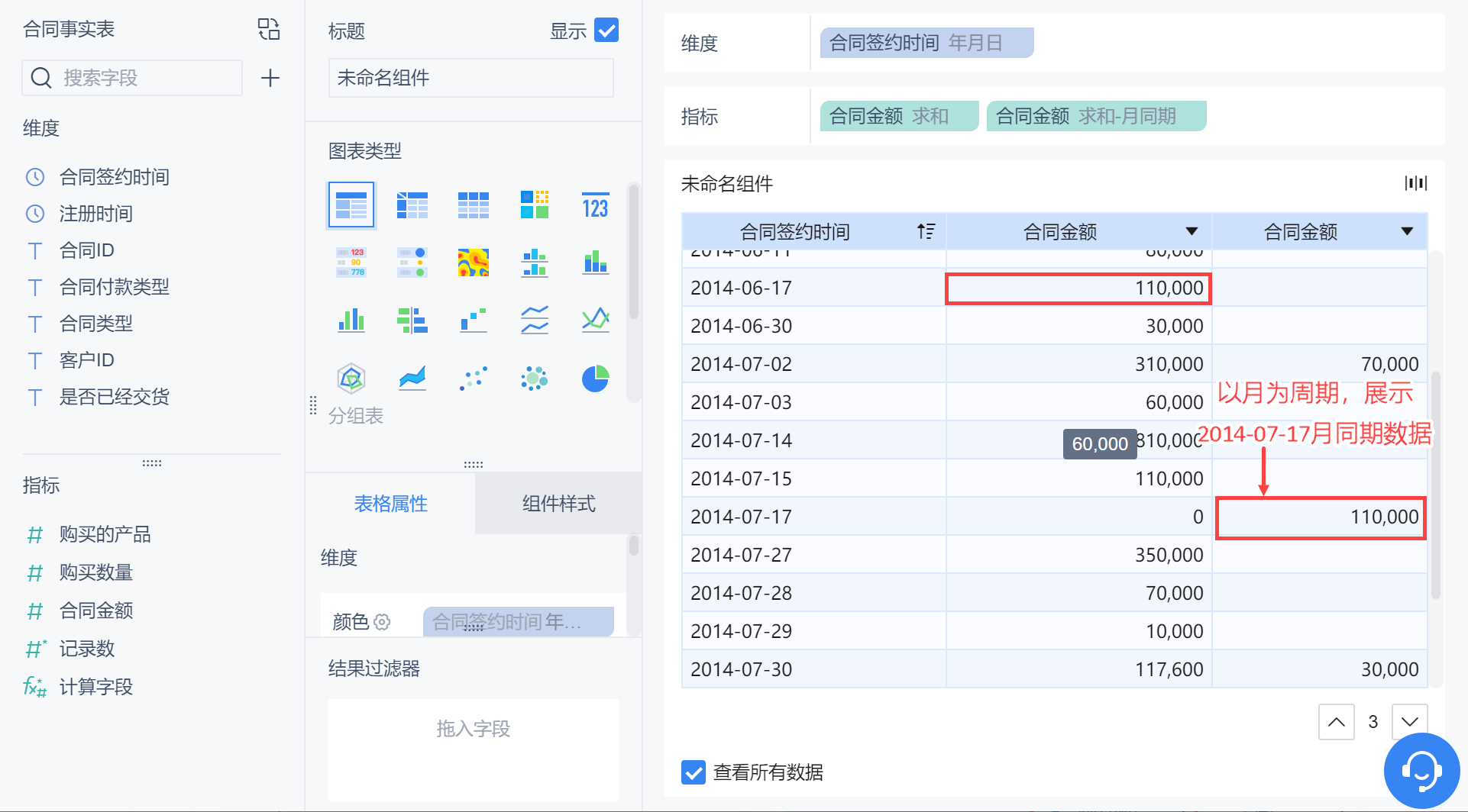 当然,若维度中拖入「合同签约时间」,分组为「年月日」,则可支持设置「年、季度、月、周」同期,例如设置以月为周期的同期数据,如下图所示: