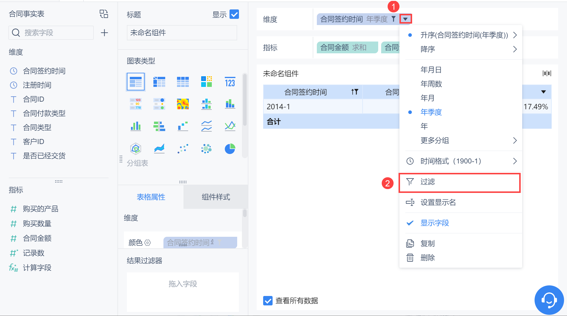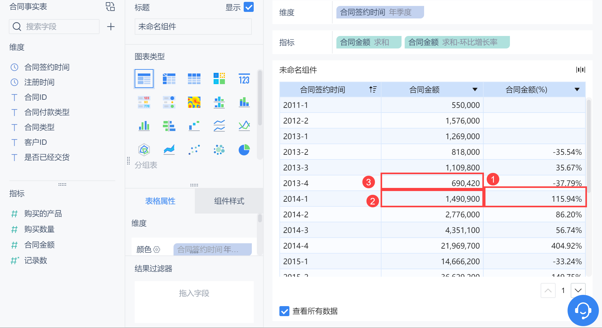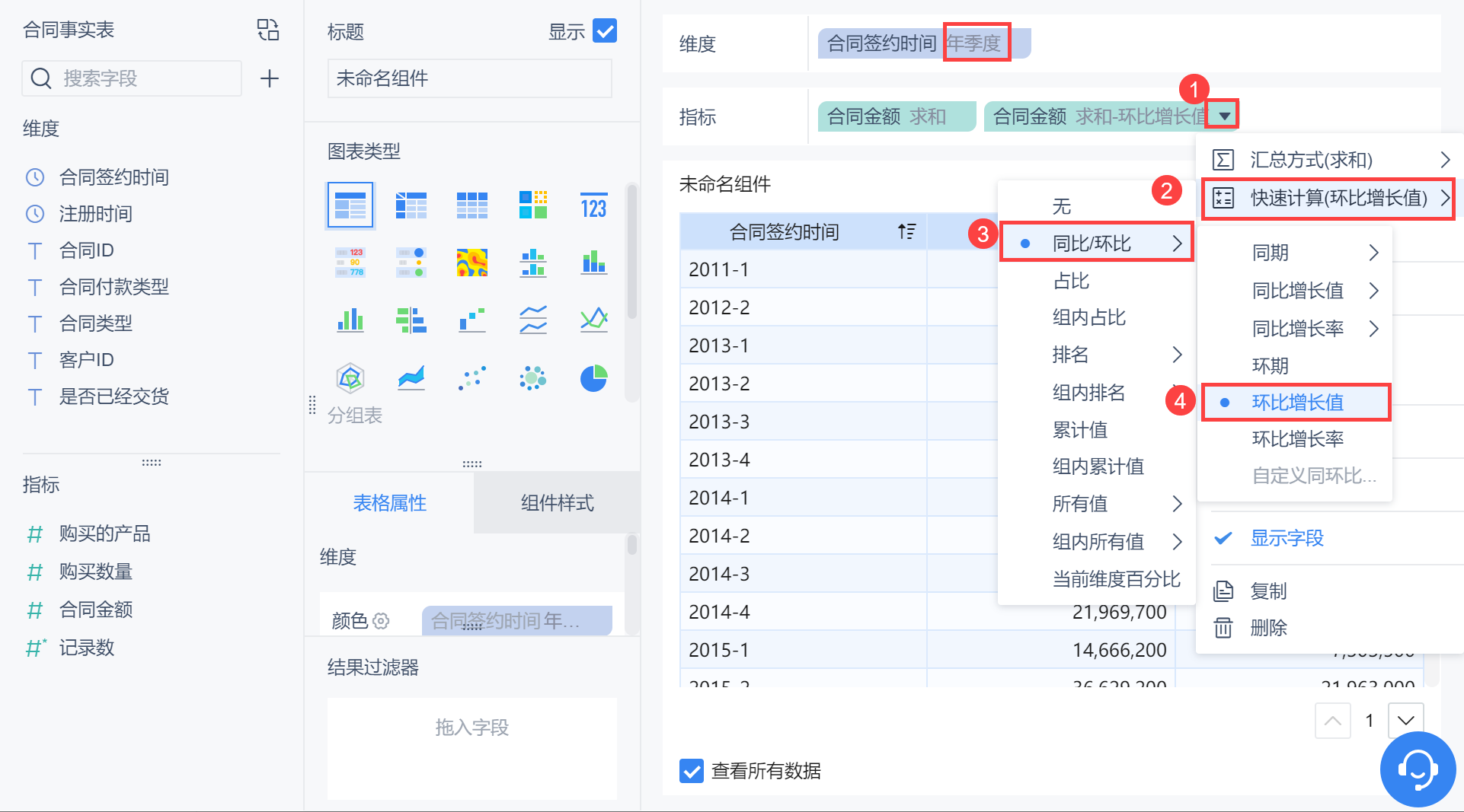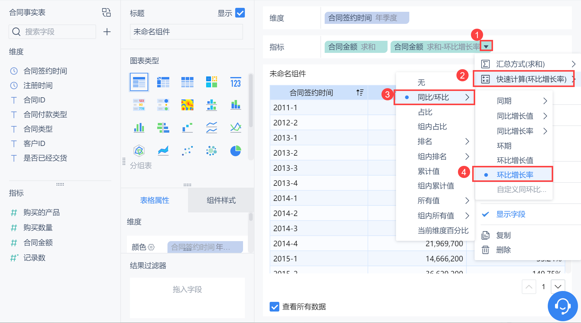 维度中拖入「合同签约时间」,更改分组为「年季度」,对合同金额点击「下拉>快速计算>同比/环比>环比增长率」,如下图所示: