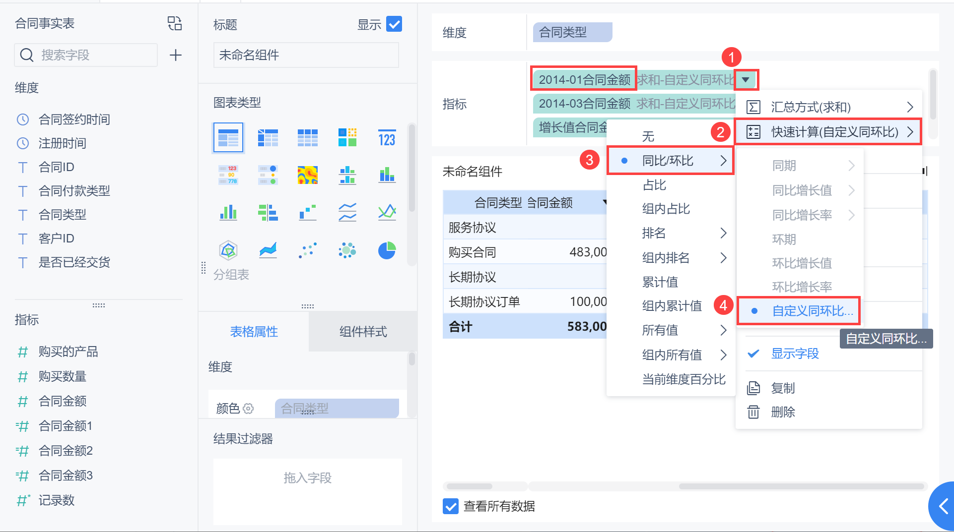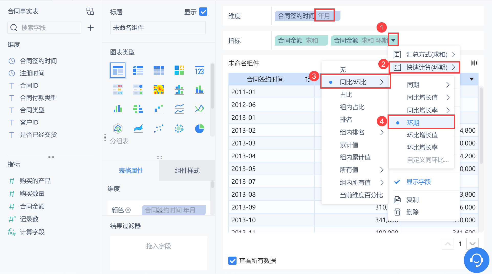 维度中拖入「合同签约时间」,更改分组为「年月」,对合同金额点击「下拉>快速计算>环期」,如下图所示: