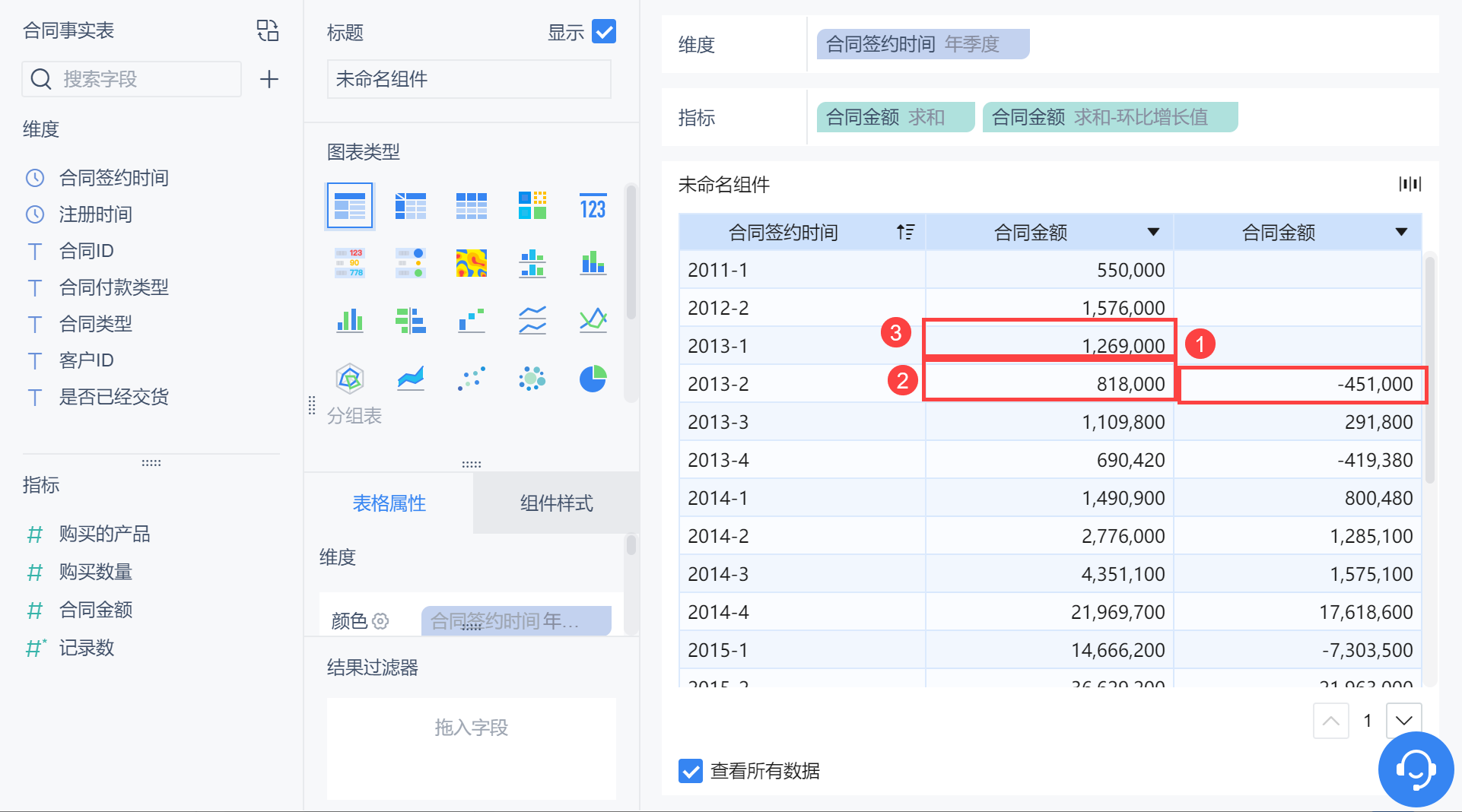 维度中拖入「合同签约时间」,更改分组为「年季度」,对合同金额点击「下拉>快速计算>同比/环比>环比增长值」,如下图所示: