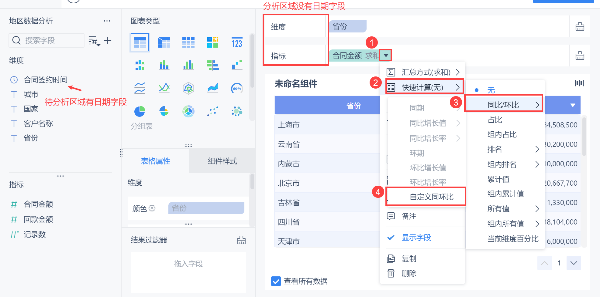 分析区域不包含「日期」字段,即维度栏为非「日期」字段时,且待分析区域有「日期」字段,支持通过自定义同环比的方式快捷计算「对比值、增长值、增长率」。