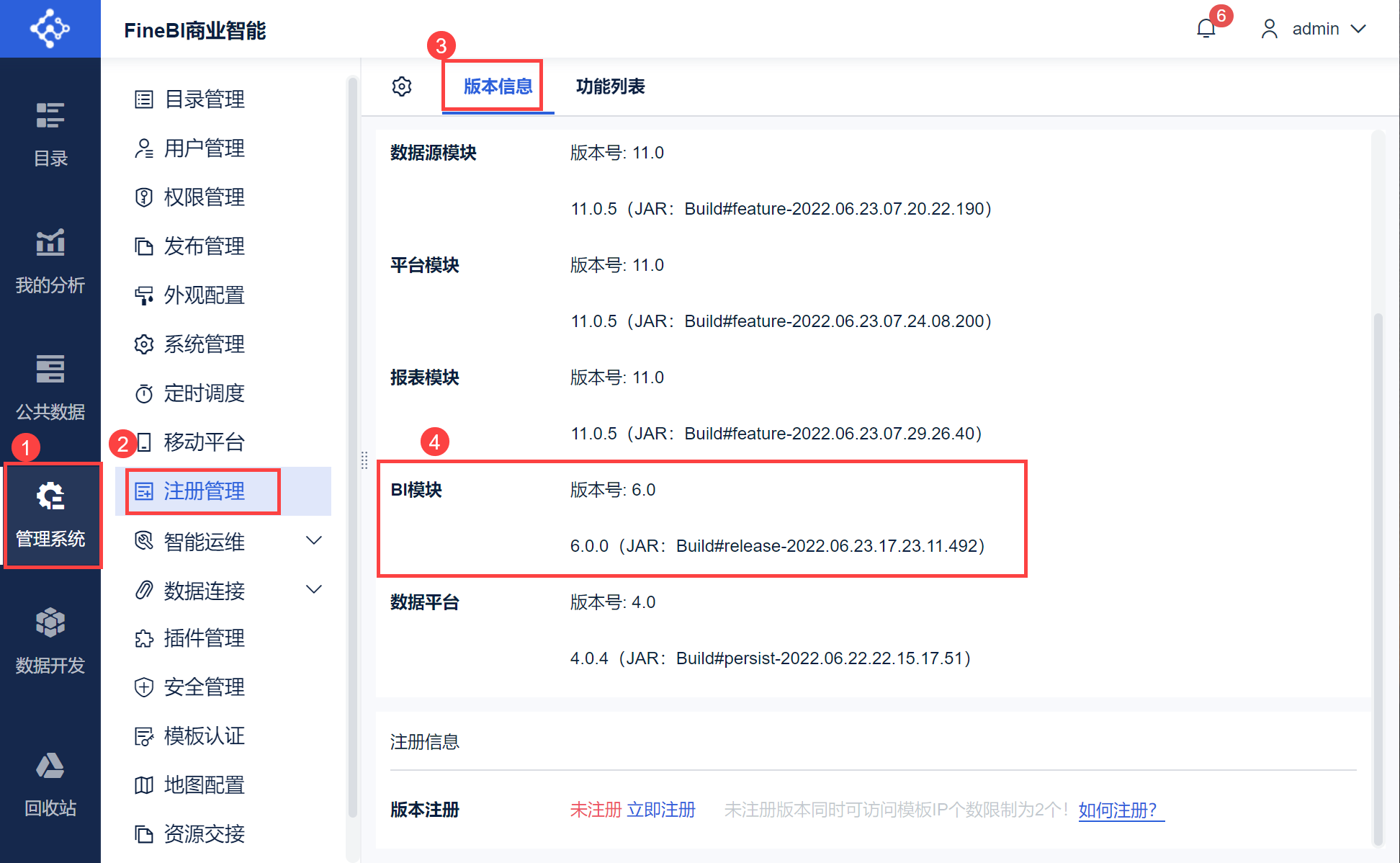 进入「管理系统<注册管理<版本信息 」 ,即可查看到 FineBI 的版本信息。