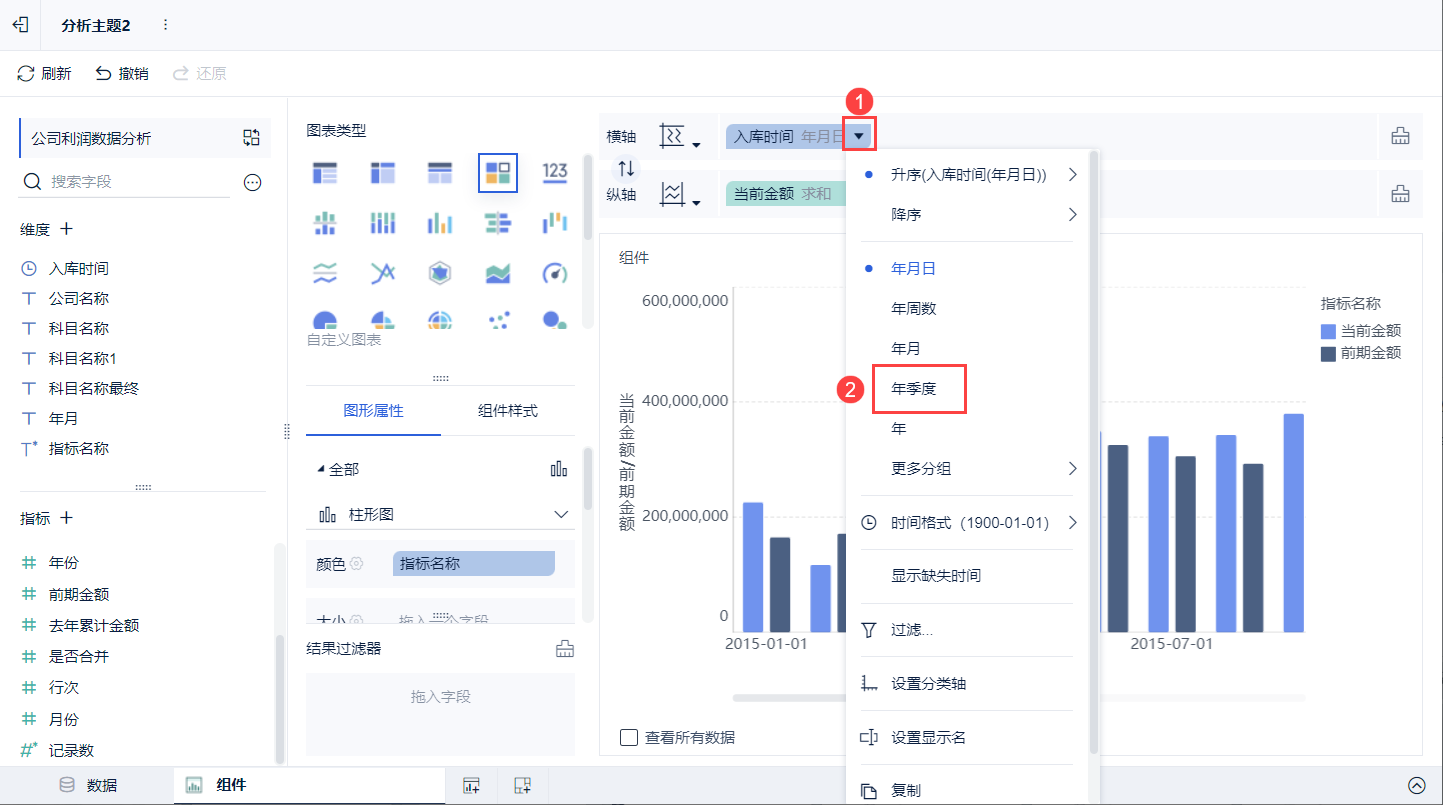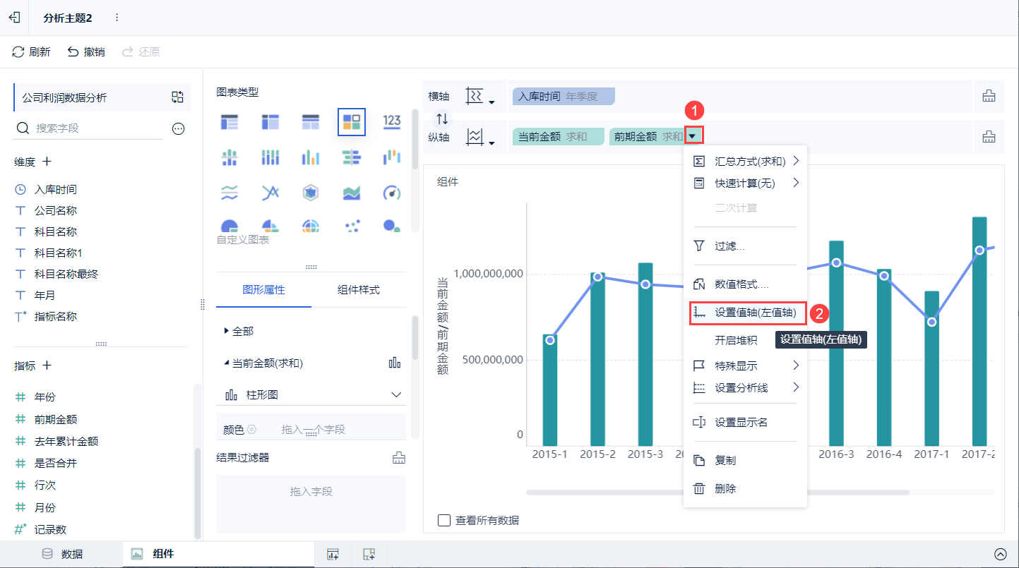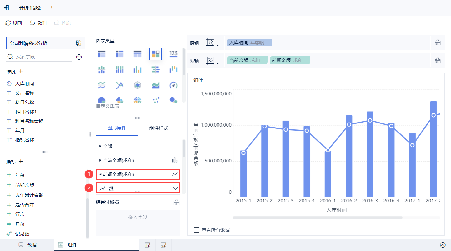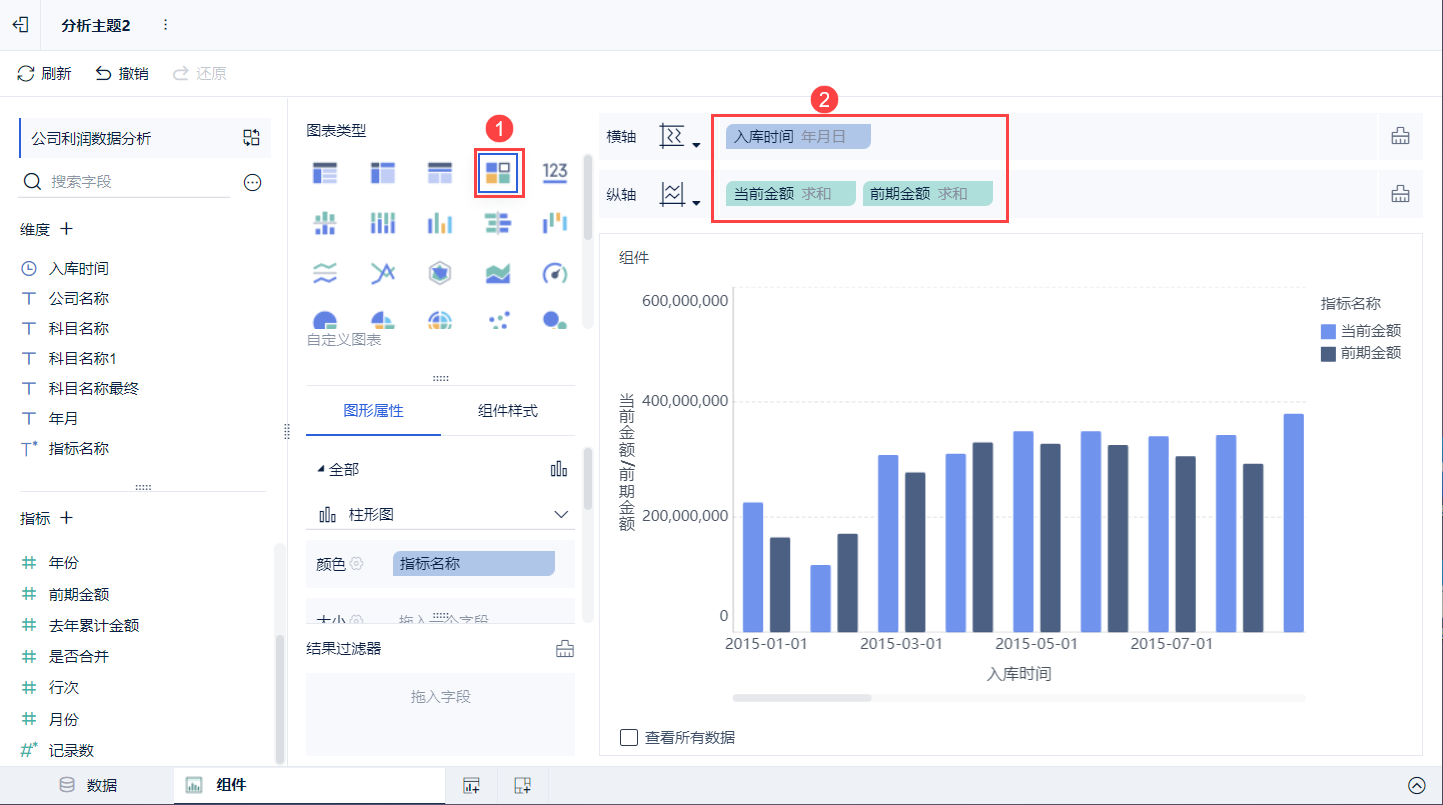 2)在图表类型下选择「自定义图表」,「入库时间」字段拖入到横轴中,「当前金额」、「前期金额」拖入到纵轴中。如下图所示: