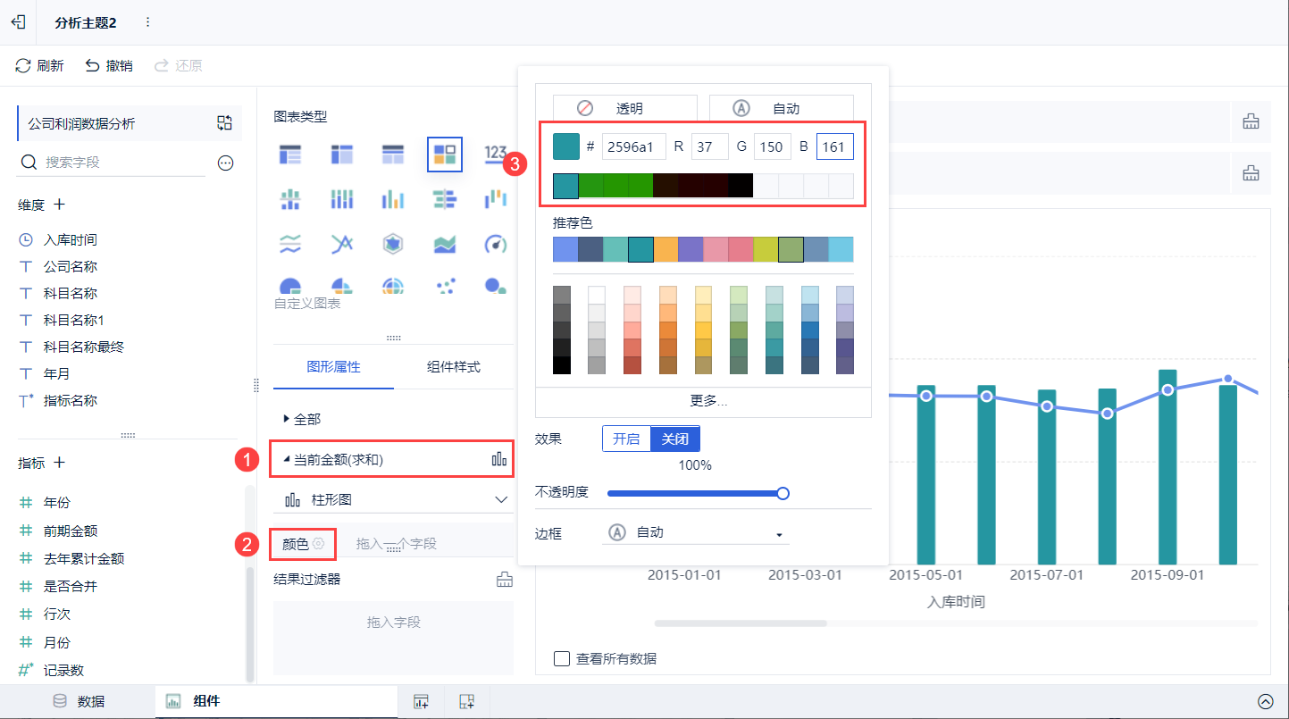 点开「当前金额」的颜色栏,设置柱形图颜色。再以相同步骤,点开「前期金额」颜色栏,设置颜色。