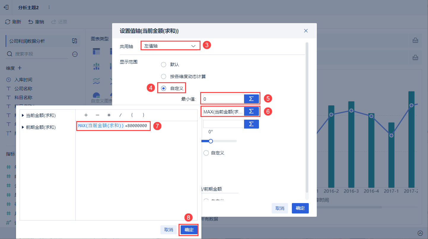 鼠标悬浮在「当前金额」上,点击右下角的倒三角,设置左值轴。设置最小值为0,最大值为MAX(当前金额(求和))+80000000。如下图所示: