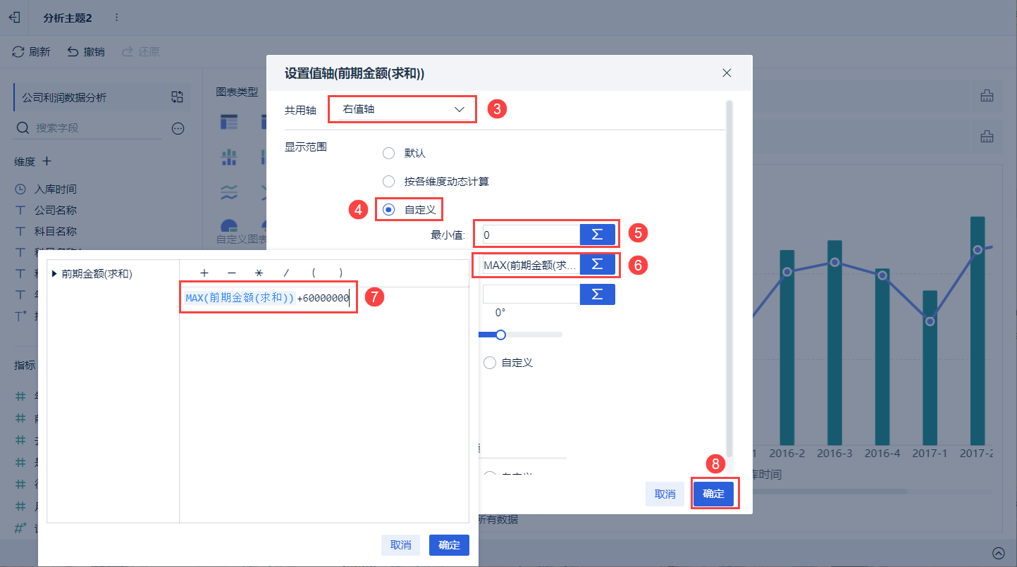 鼠标悬浮在「前期金额」上,点击右下角的倒三角,设置右值轴。设置最小值为0,最大值为MAX(前期金额(求和))+60000000。如下图所示: