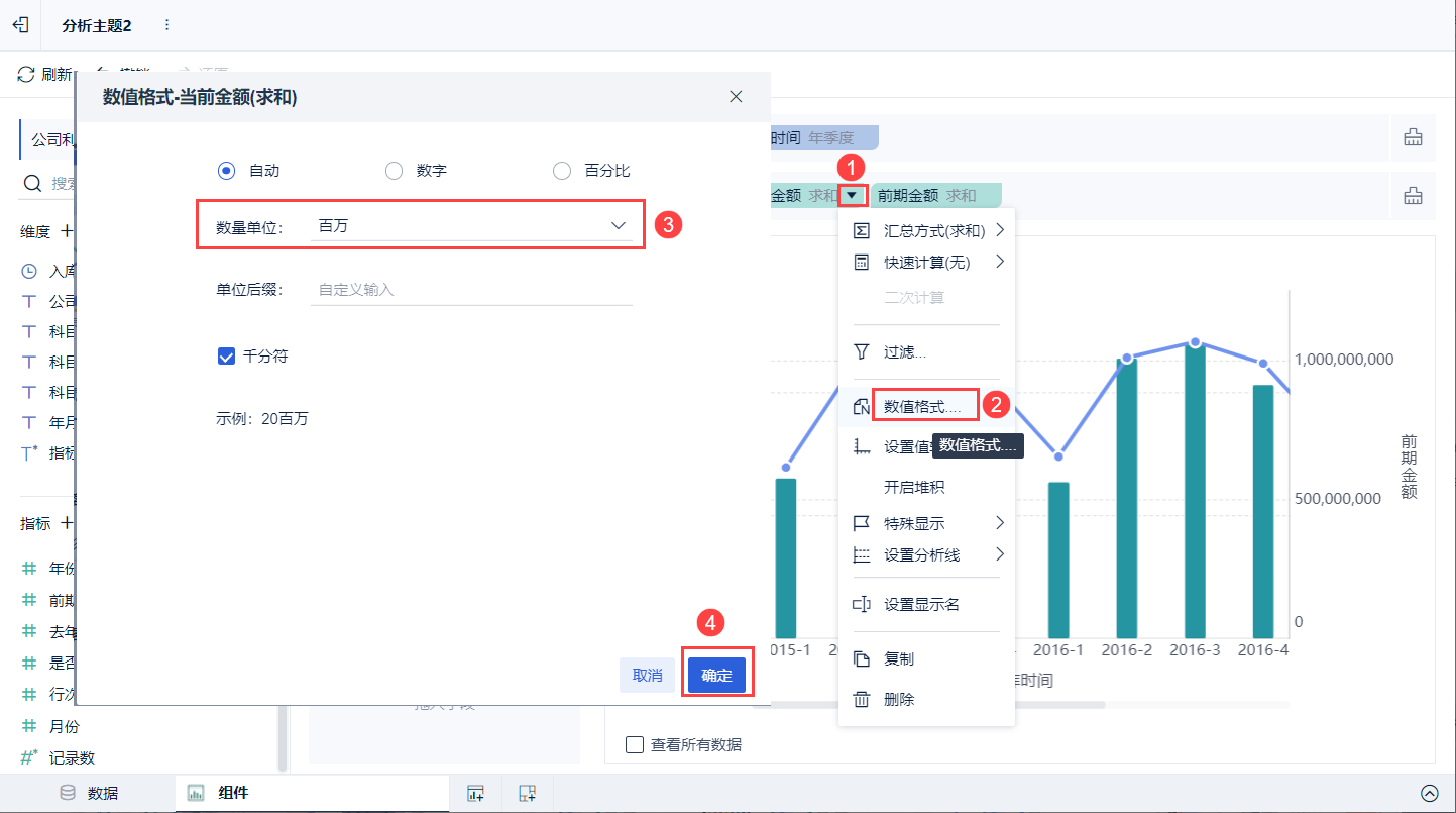 2)鼠标悬浮在「前期金额」上,点击右下角的倒三角,点击「数值格式」,设置右值轴轴标签的数值格式为「百万」,步骤参考本节步骤 1 。