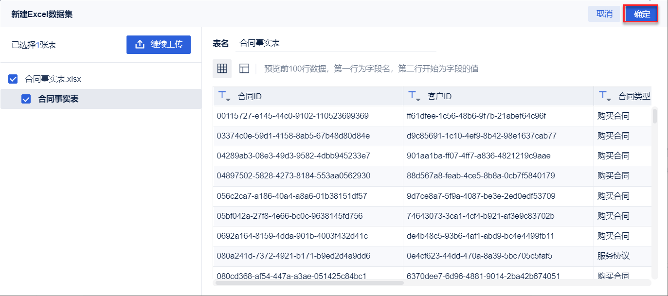 2)点击「本地Excel文件>上传数据」,上传表数据。如下图所示: