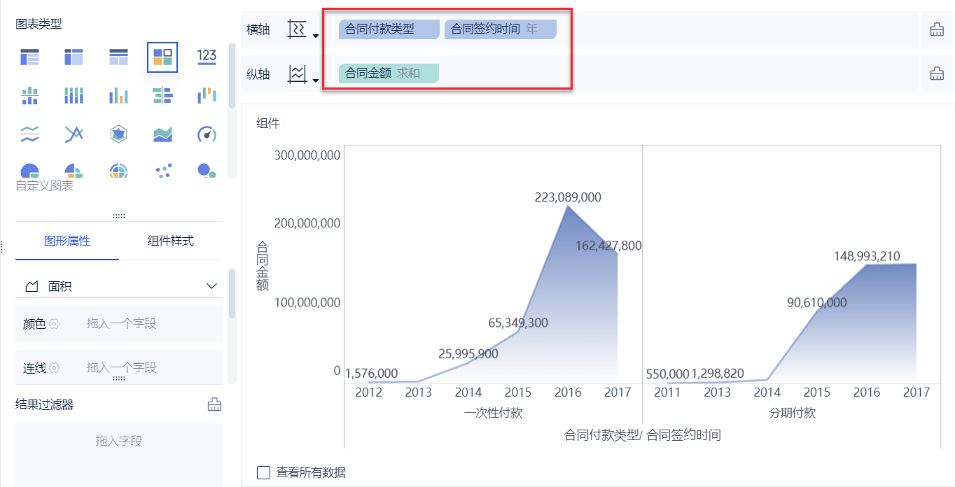 横纵轴同样支持拖入多个字段多维度多指标展示,比如按照「合同付款类型」查看查看合同金额走势,如下图所示: