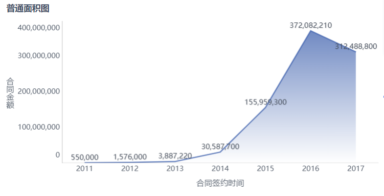 面积图可用来展示持续性数据,可很好地表示趋势、累积、减少以及变化等。例如,展示「合同金额」随日期的变化。如下图所示: