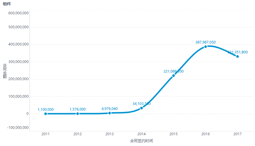 3)鼠标悬浮在横轴中的「合同签约时间」字段上,点击「倒三角>年」,展示不同年份合同金额的变化趋势。如下图所示: