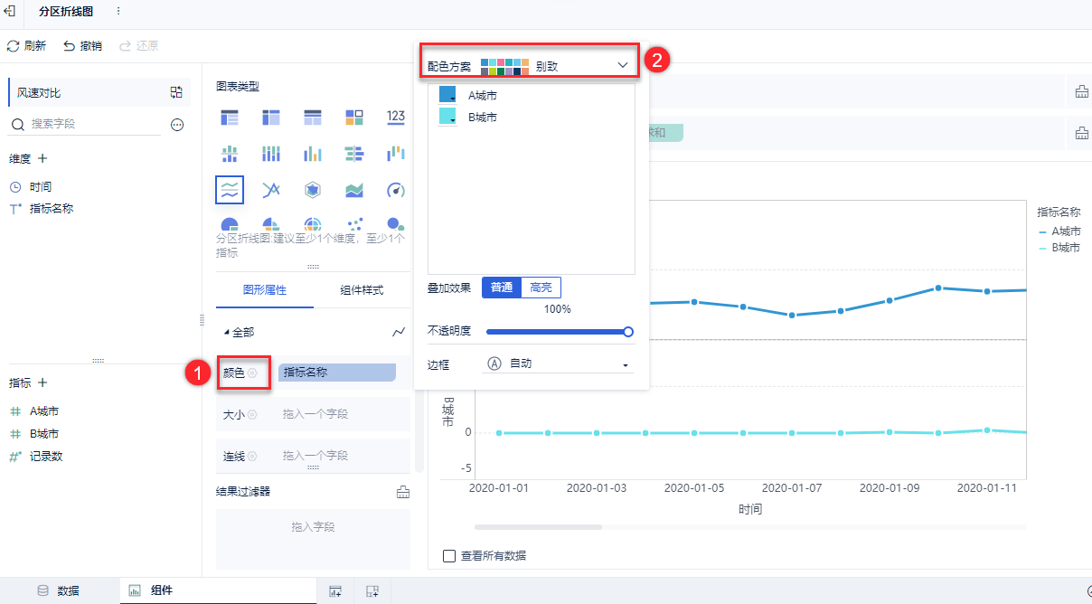 注:该分区折线图必须在横纵轴中有大于等于1个维度、大于等于1个指标字段才能选择,否则图表类型下的分区折线图将灰化无法点击。