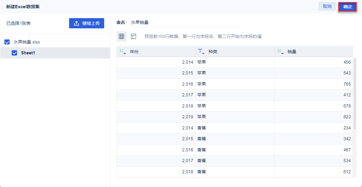 2)点击「本地Excel文件>上传数据」,上传表数据。如下图所示: