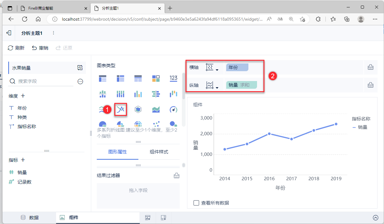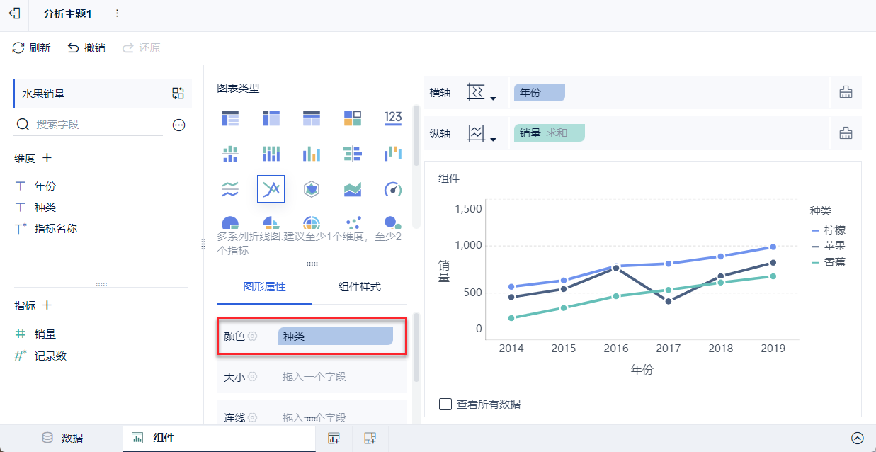 3)选择「多系列折线图」,将「年份」字段拖入横轴,「销量」字段拖入纵轴。如下图所示: