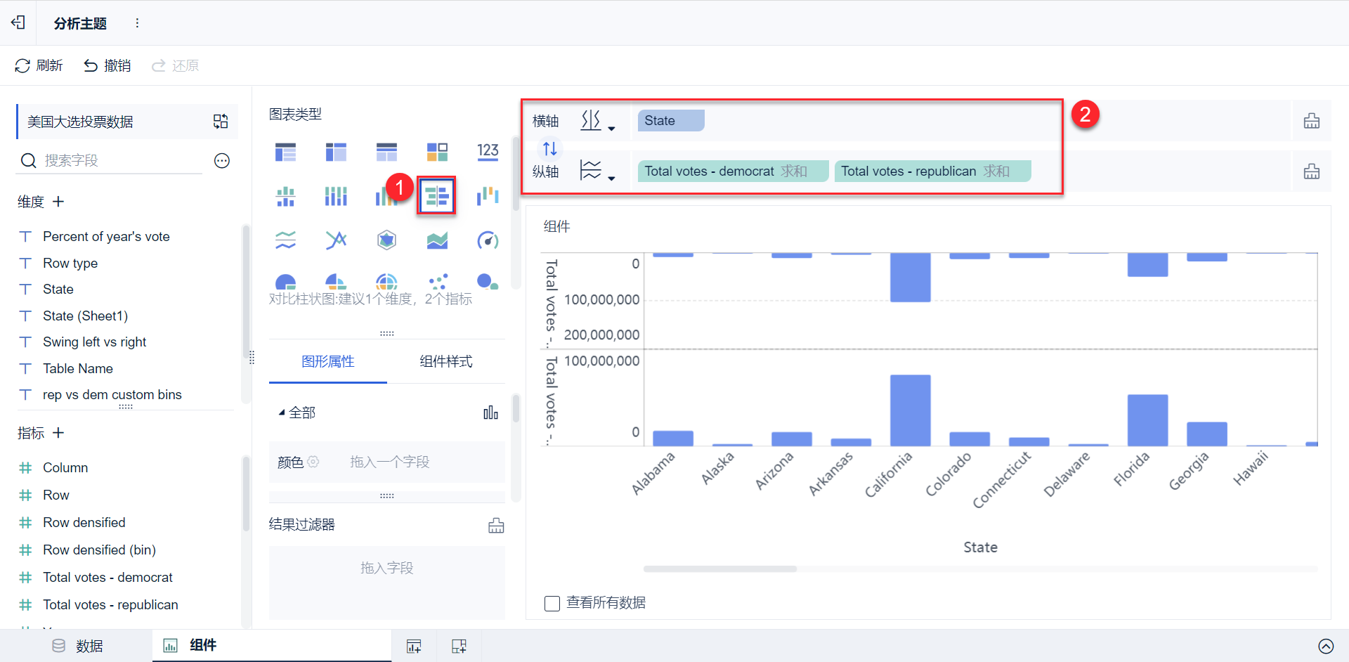2)在图表类型下选择「对比柱状图」,将「State」字段拖入到横轴中,「Total votes - democrat」、「Total votes - republican」字段拖入到纵轴中。如下图所示: