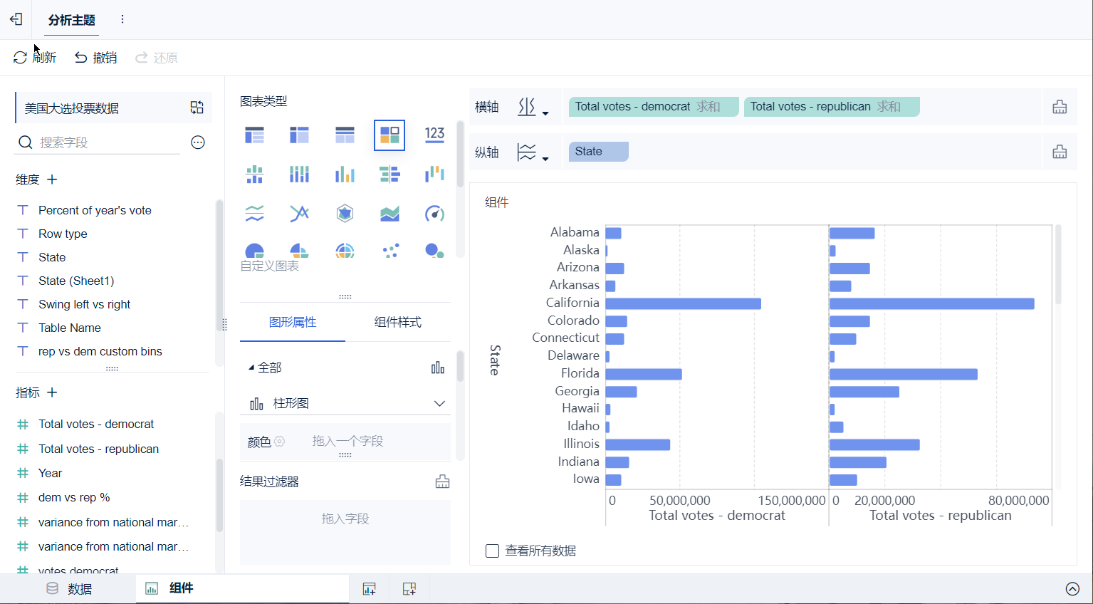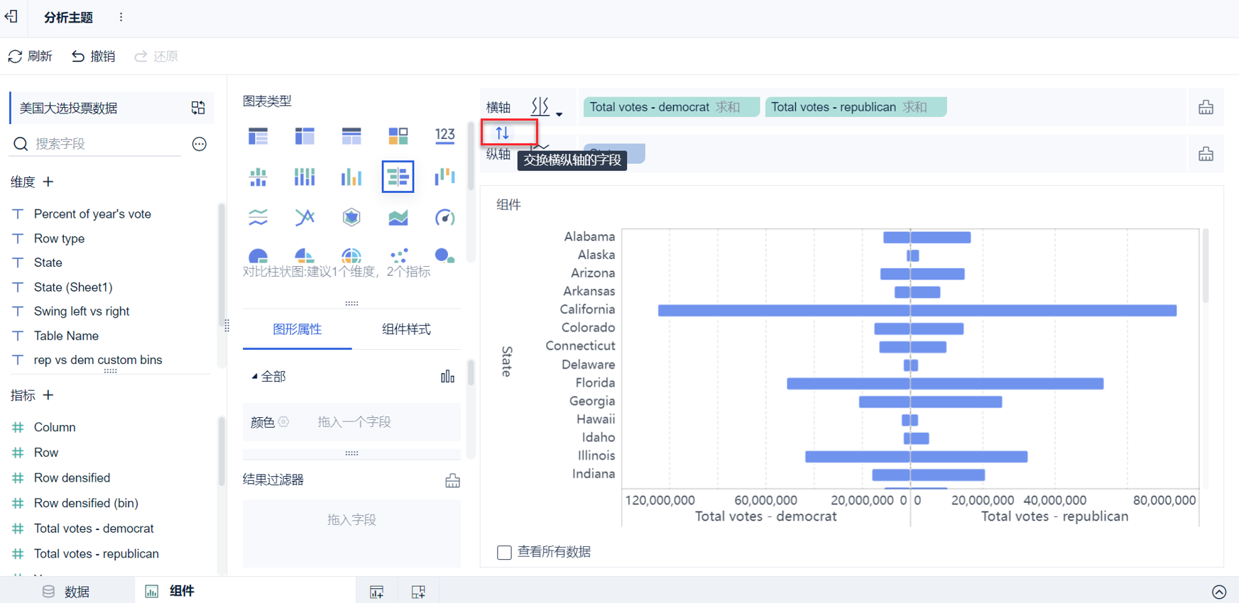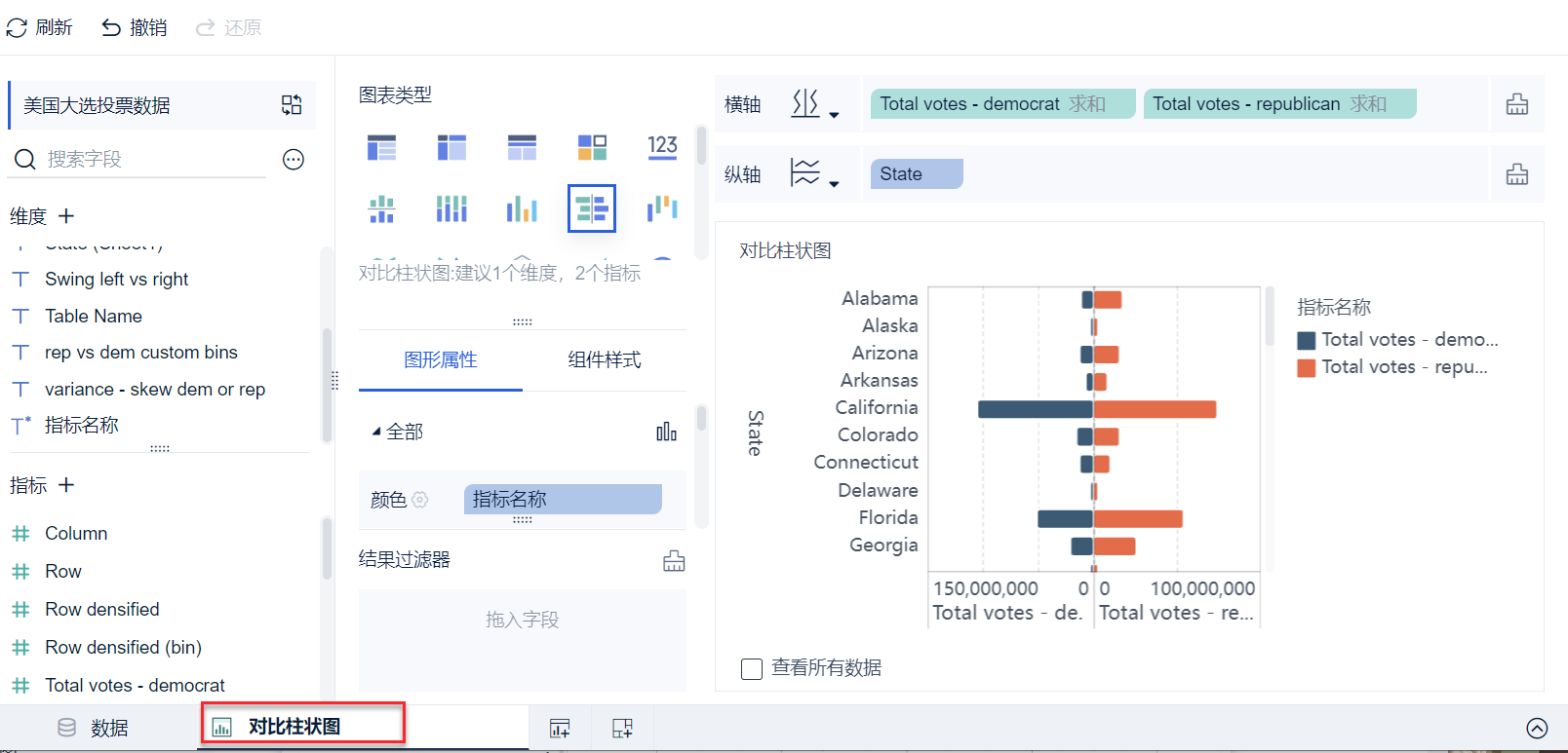 2)将「State」字段拖入到横轴中,「Total votes - democrat」、「Total votes - republican」字段拖入到纵轴中,在图表类型下选择「对比柱状图」。如下图所示: